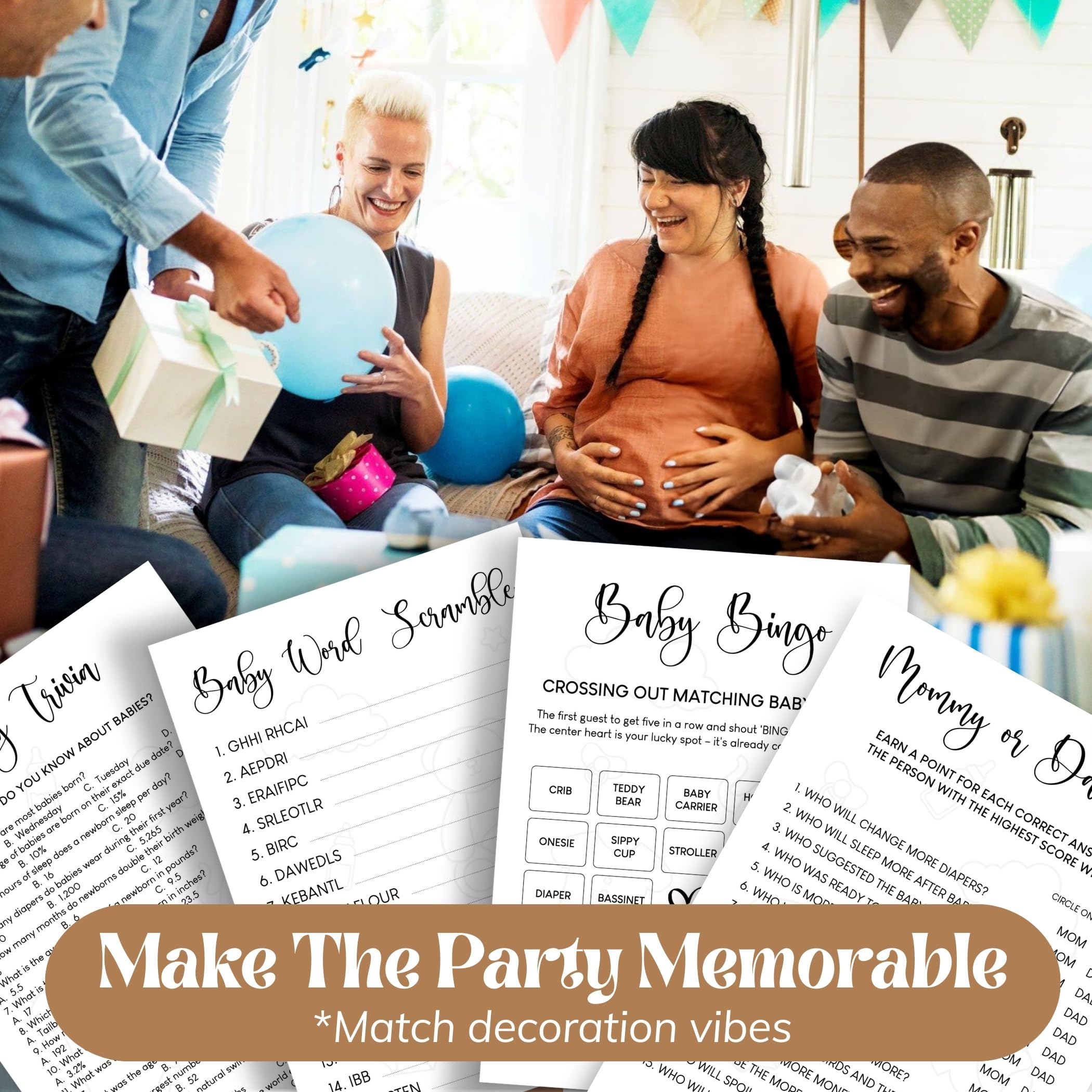 Baby Shower Activities For Guests: This set features the popular baby shower bingo cards, baby shower trivia game, who knows mommy best baby shower game, baby shower word scramble, providing everything needed to play and enjoy during the baby shower.
