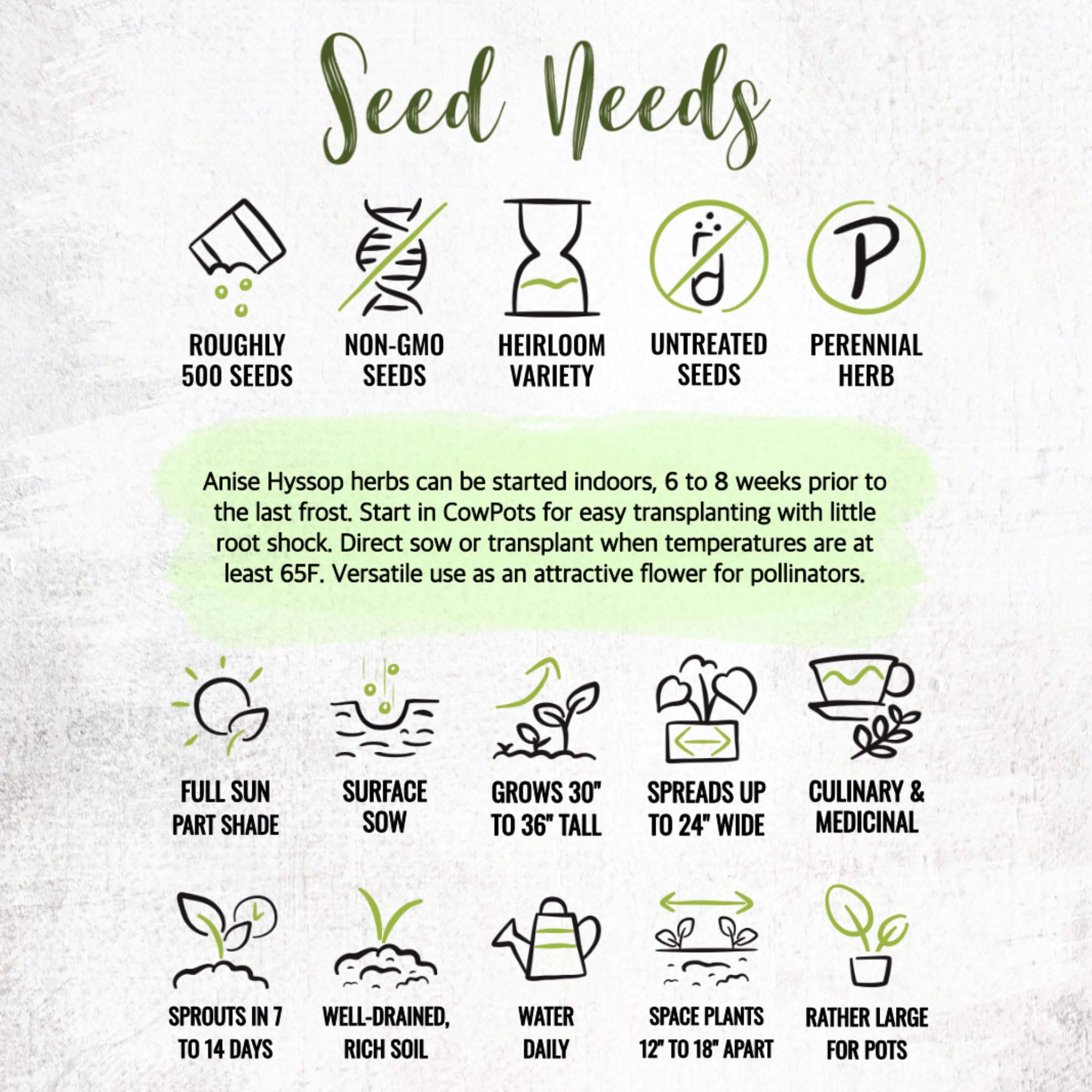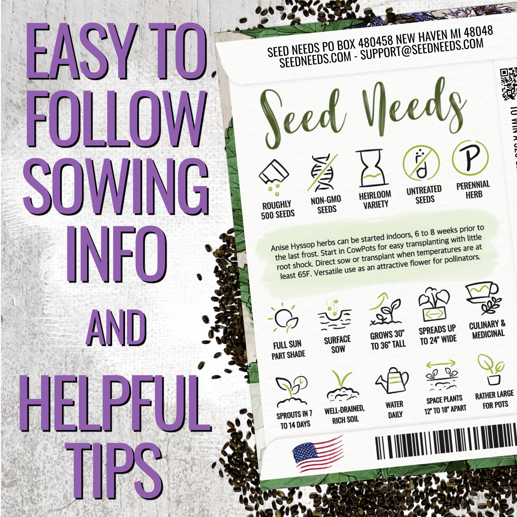 Quality: All Anise Hyssop seeds packaged by Seed Needs are intended for the current and the following growing seasons. All seeds are stored in a temperature controlled facility that is free of significant amounts of moisture.