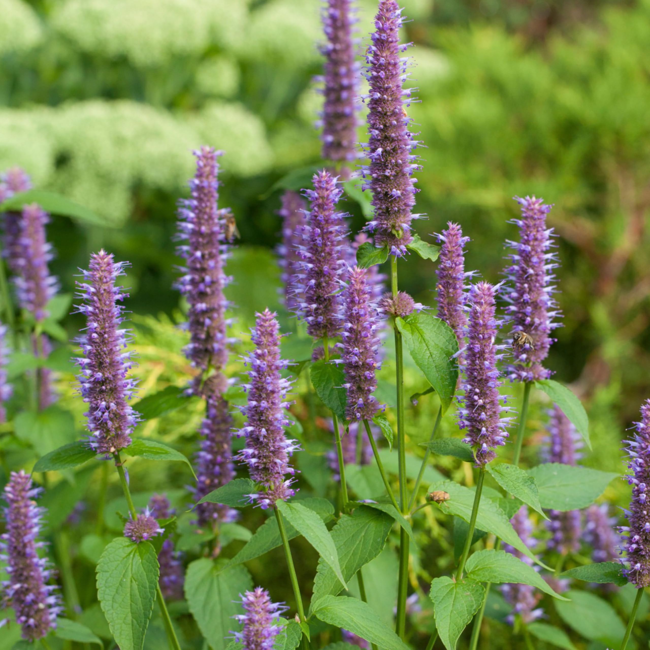 The plants feature spikes of small, purple-blue flowers that bloom from summer to fall, drawing bees, butterflies, and hummingbirds as key pollinators.