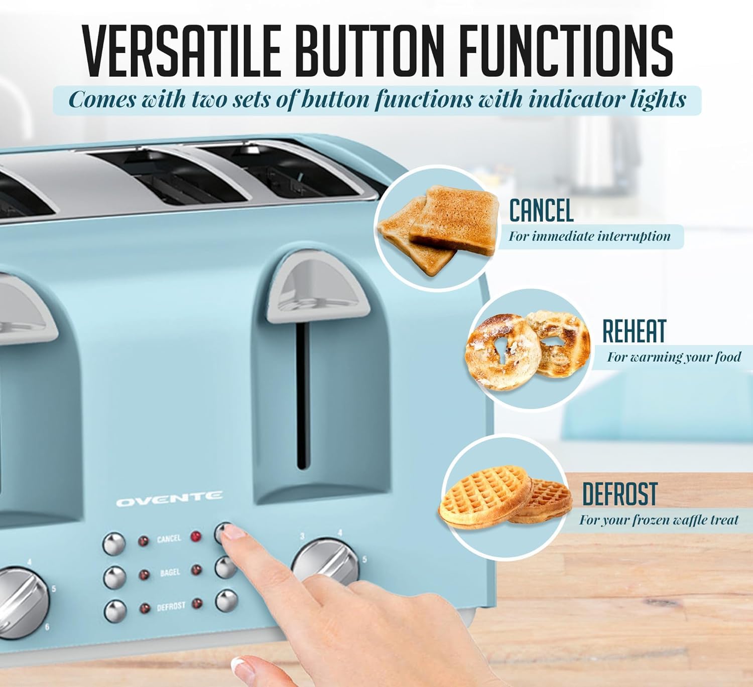 Introducing OVENTE’s 4-Slice Toaster TS4410LBL – A must-have kitchen essential to elevate your breakfast experience! Designed for both style and efficiency, this toaster combines a sleek, modern look with powerful functionality. It features four wide slots, perfect for everything from thick bagels to artisanal loaves of bread. With dual independent controls, you can customize the browning level for each pair of slots, ensuring consistently even toasting every time. The adjustable 6-shade browning settings give you complete control, allowing you to achieve your desired level of crispiness. Equipped with a pop-up lever and high-lift feature, retrieving even the smallest slices or delicate pastries is effortless and safe, without the need for utensils. Versatile functions like defrost and reheat make this toaster perfect for any meal or snack. Plus, with the simple press of the cancel button, you can stop the toasting cycle at any time. Upgrade your mornings with the OVENTE 4-Slice Toaster TS4410LBL – the ultimate blend of convenience, style, and perfectly toasted bread every time!