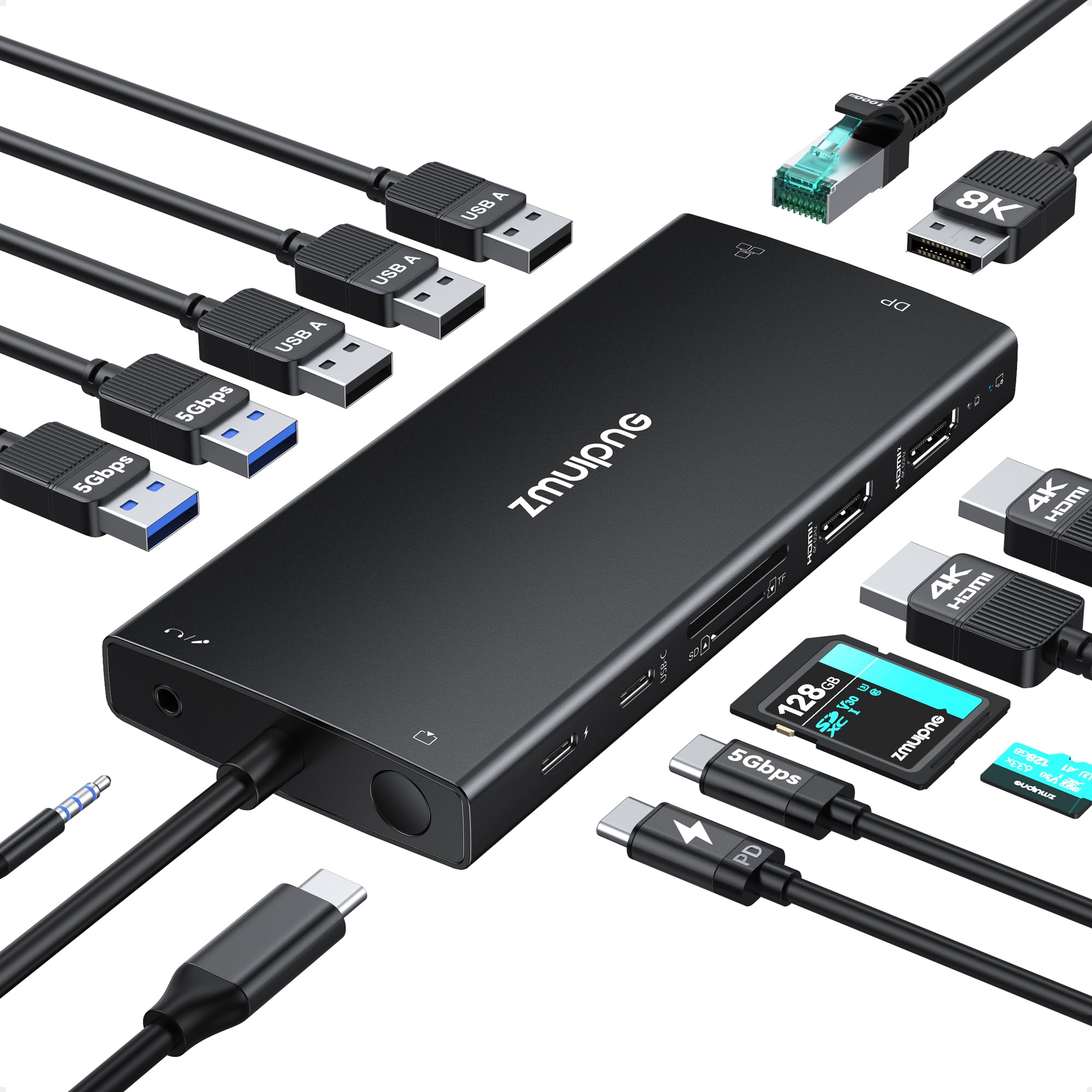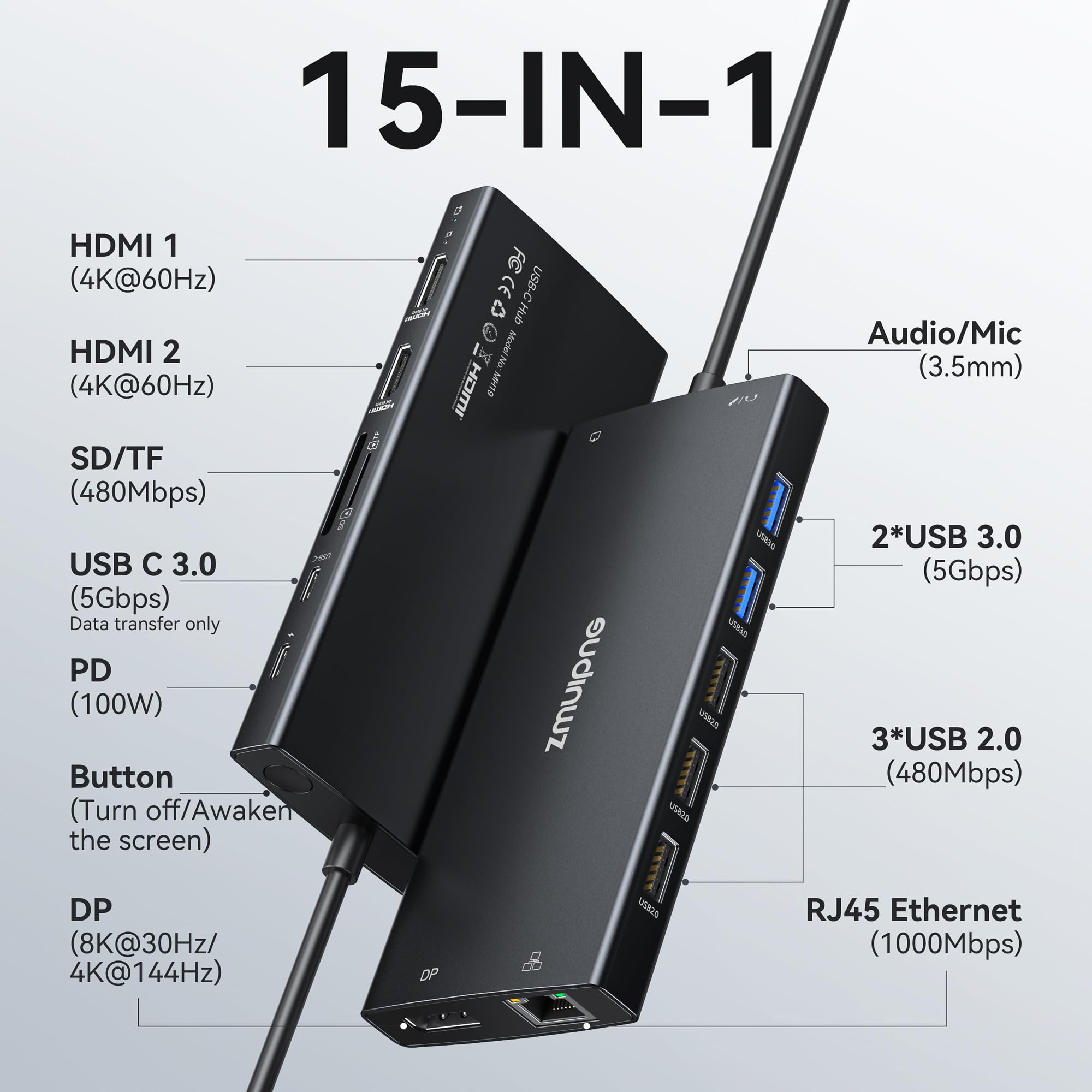USB C Docking Station 15 IN 1: With this USB C hub multiple adapter you can easily extend your laptop from one type c/thunderbolt 3 port into 14 ports, you get 2*4K@60Hz HDMI, 8K@30HZ / 4K@144HZ DP, turn off button, compatible and working detection lamp, 3*USB 3.0 ports, USB C 3.0 port, 2*USB 2.0 ports, 100W USB C PD Port, 1Gbps Gigabit Ethernet, SD/Micro SD card readers and 3.5mm Mic/audio. USB C to dual HDMI Adapter widely applicable for Dell XPS13/15, Dell Latitude 13 7000/ E7370, etc