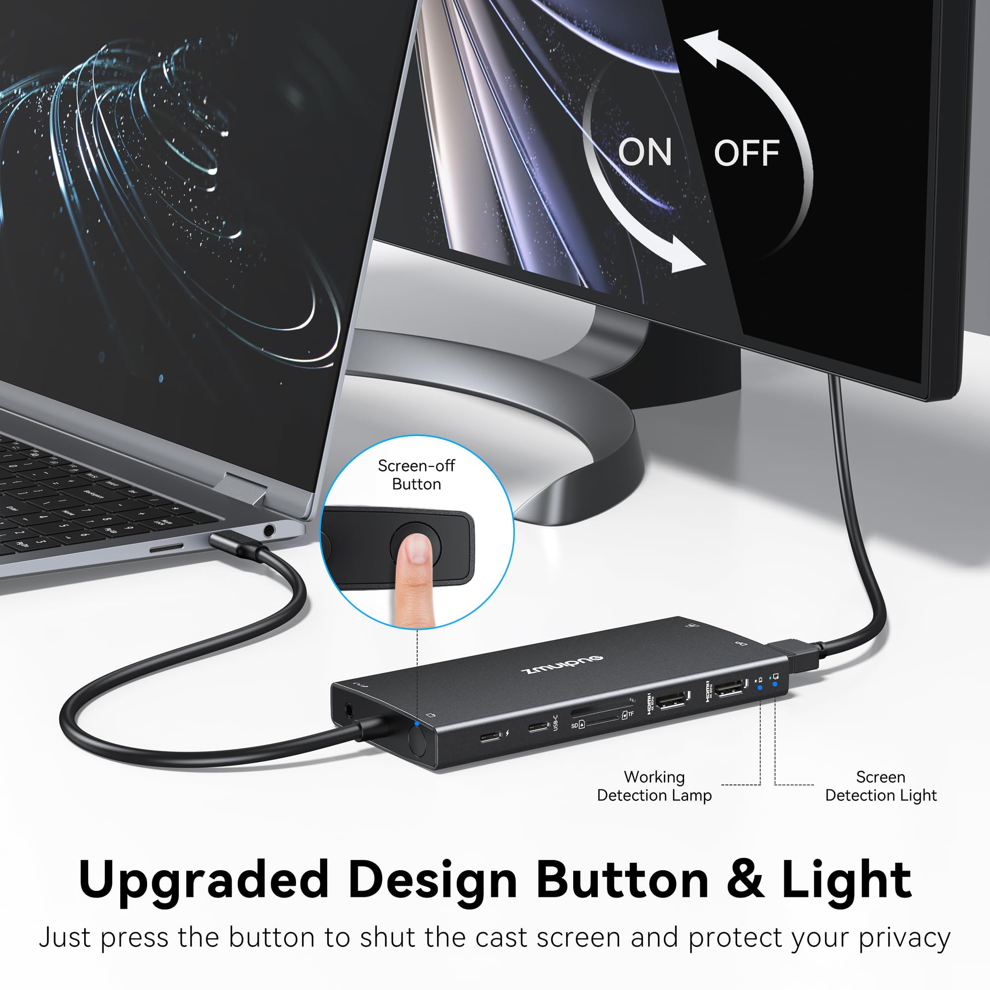 Turn Off Button & Detection Lamp: The docking station 3 monitors have the wake up/turn off display button. One-click switching of monitors, no complicated operations toplug and unplug, while protecting your privacy. The compatible and working detection lights let you identify at a glance whether the usb c dock is compatible with your laptop. When both lights are on, the laptop docking station is compatible with your laptop and can work properly. NOTE: you need an HDMI to HDMI or a DP to DP cable