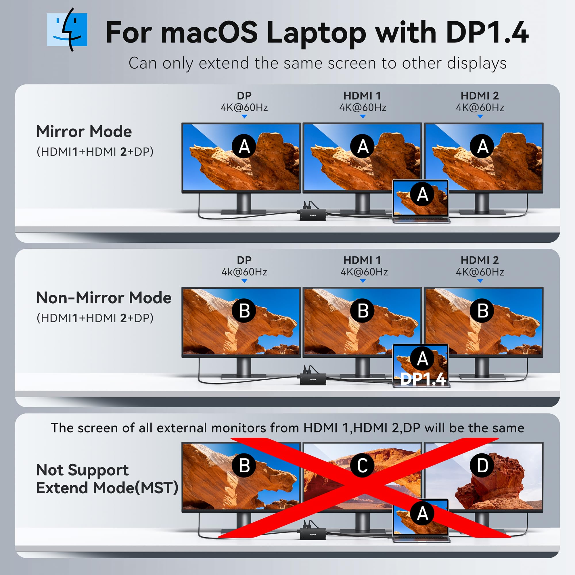 4K Dual Monitor&Triple Display: The docking Station dual monitor can easily to achieve dual-monitor and triple-monitor displays for Windows.Single use HDMI max up to 4K@60Hz,DP up to 8K@30Hz(DP1.4). When connect 2 displays,the resolution will be dual 4K@60Hz(DP1.4). Display output will be dual 4K@60Hz and 4K@30Hz when triple display(DP1.4) .When connecting 3 monitors and only two monitors are displayed,please plug in the DP port first,then plug in the 2 HDMI ports.Mac OS ONLY Support Mirror Mode