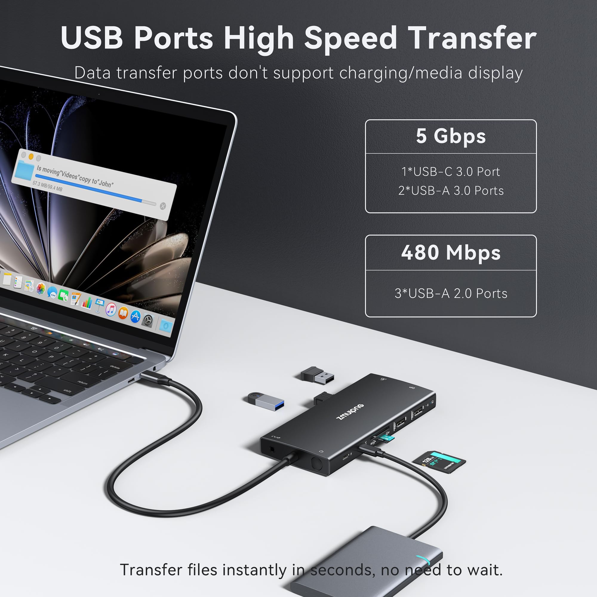 PD Charging Port & Gigabit Ethernet & Audio/Mic: This computer docking stationdual hdmi with power delivery support 100W PD Charging. This usb c docking will occupy 13W power to work, so only 87W power for laptop charging. The dual monitor docking station supports 10/100/1000BASE-T Lan networks, just plug in an ethernet cable, you can enjoy the ultra-fast gigabyte ethernet speed and the reliability of a wired connection directly. Also, this thunderbolt dock have a 3.5mm Mic/Audio(2 in 1) port for you to put in your wired headset, so that you can enjoy music without disturbing others