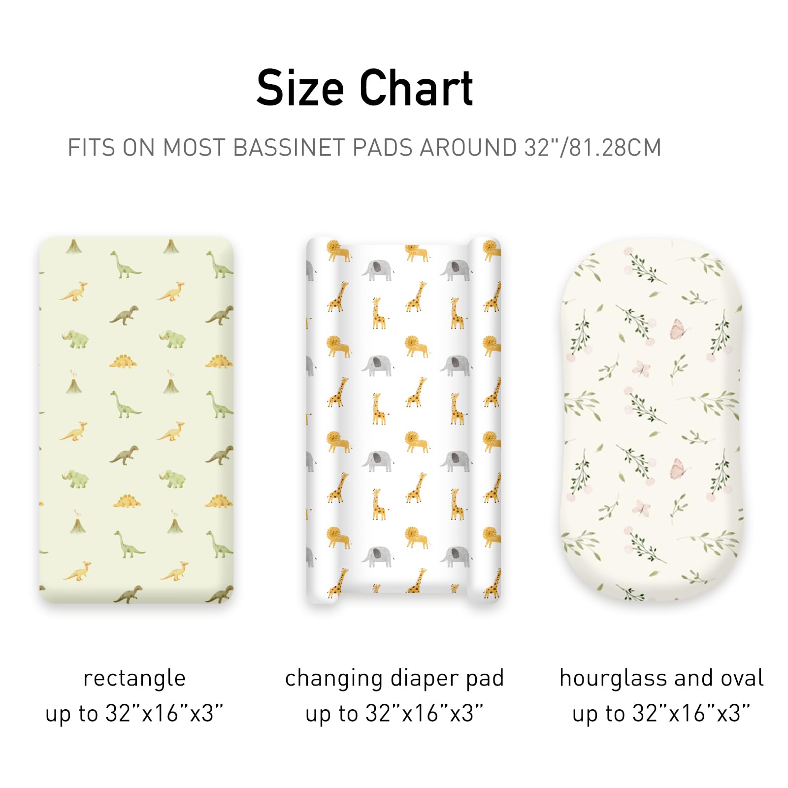 3-Pack Bassinet Fitted Sheets: Our Organic Bassinet Mattress Sheets (32"x16", up to 3" depth) offer universal fit for all bassinet mattress typesβ€”compatible with hourglass, oval, square, and rectangle designs.
