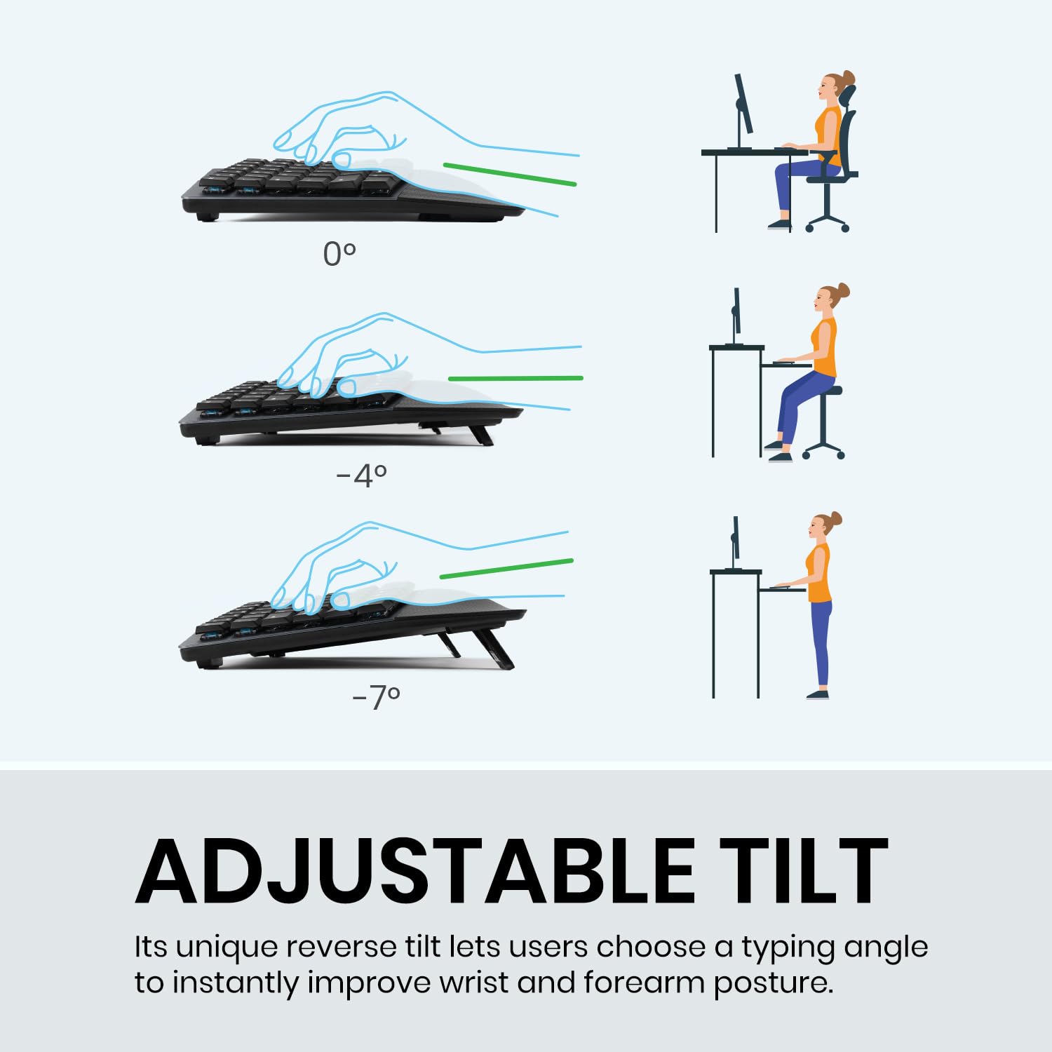 Adjustable Palm Lift & Reinforced Stability: Tilt legs (0°, -4°, -7°) support natural wrist posture for seated or standing use. Optional 3D-print block reinforces leg stability, available on Amazon or via the Perixx website.