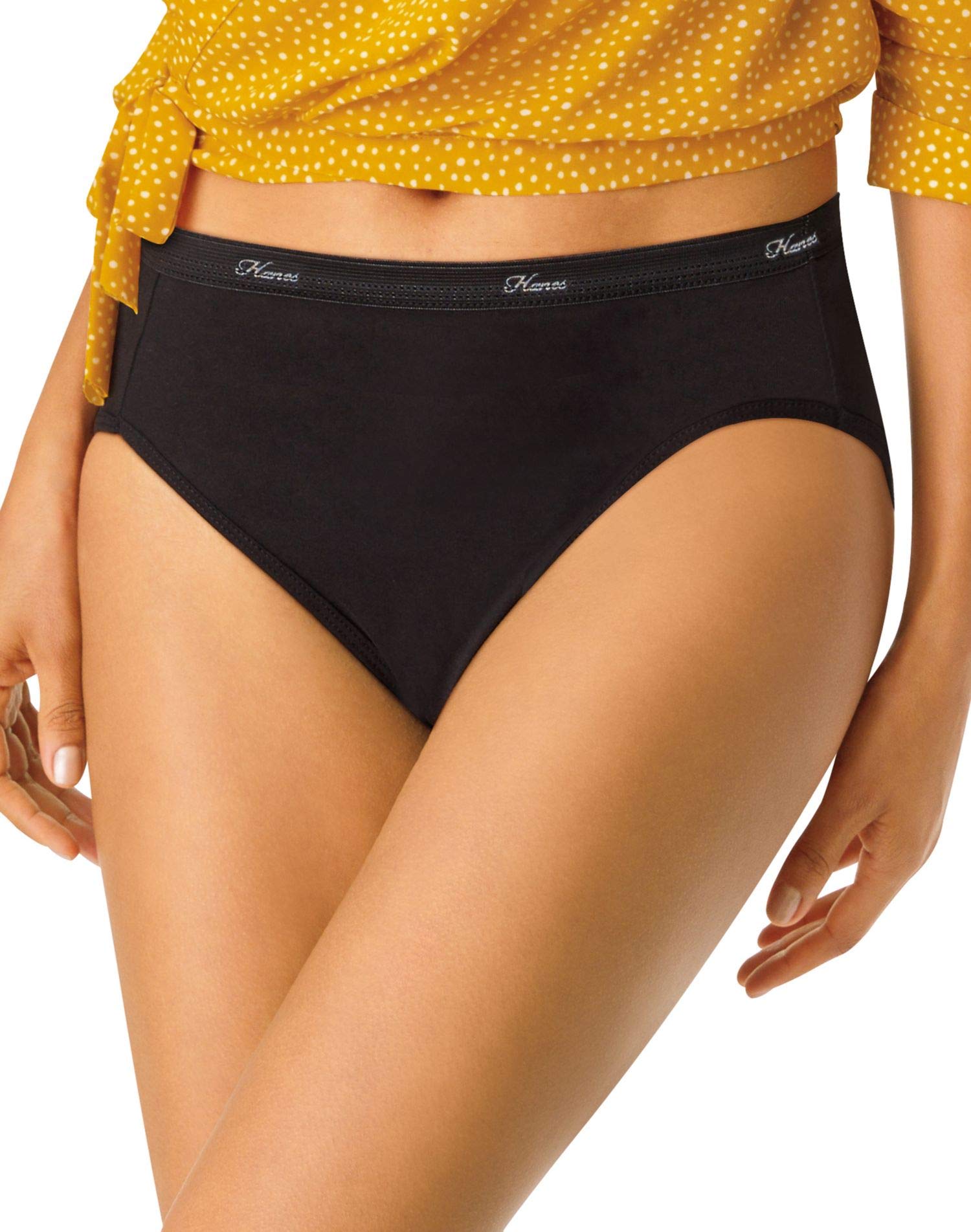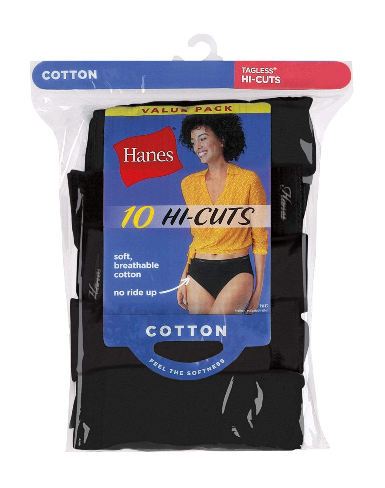 Description When you need to stock up on the best cotton hi-cuts you can find, trust the experts at Hanes. These better-than-basic high-cut panties are made with Cool Comfort fabric that wicks away moisture from your skin to keep you cool all day. The silhouette is just what you want in a leg-flattering underwear, with high-cut legs and a full-coverage back for a sleek, smooth look under clothes. The logo waistband of these moisture-wicking panties is soft, stretchy, and plush for comfort where you need it most. Stock up with this value pack of 10 pairs of hi-cut women's underwear for a style and fit you're sure to love.