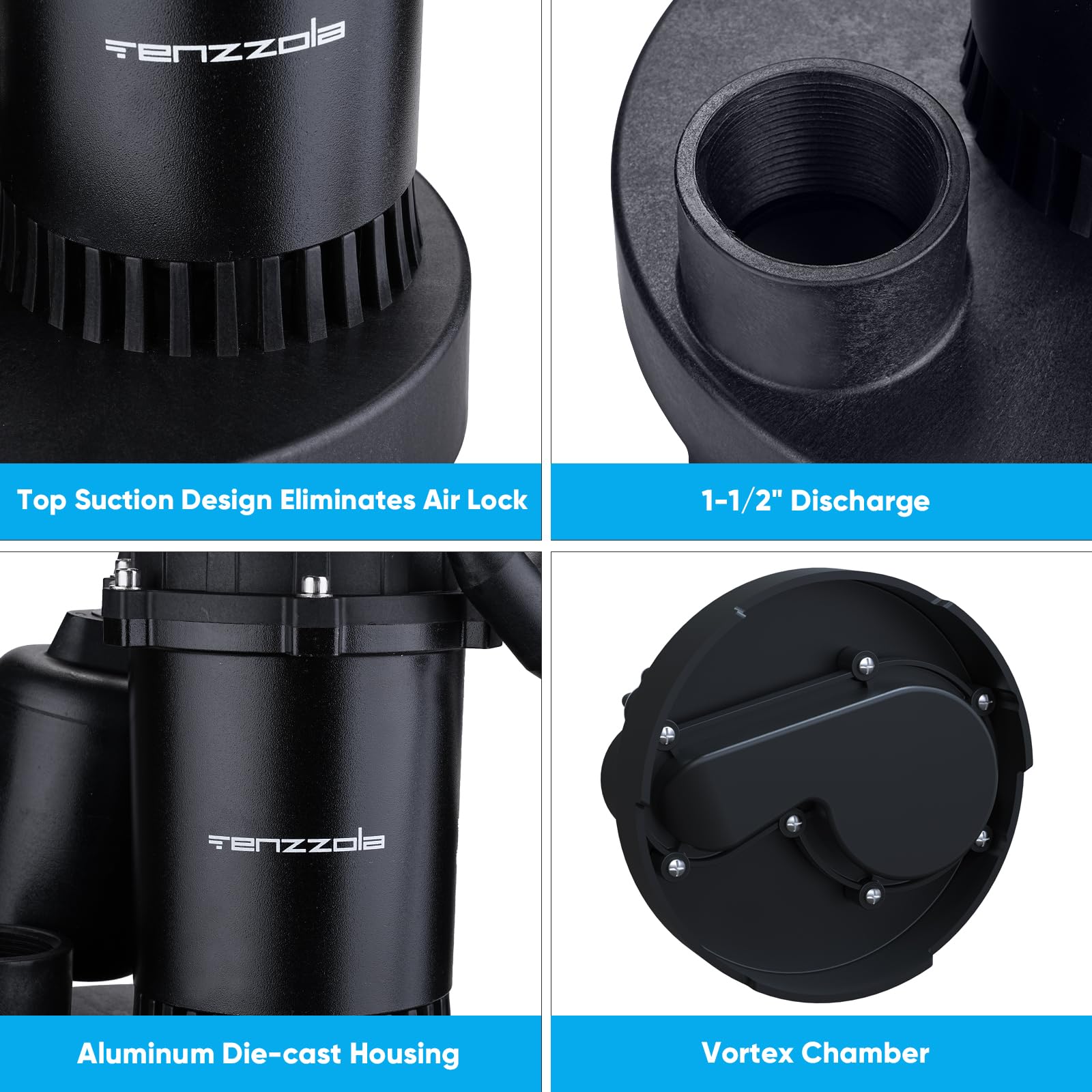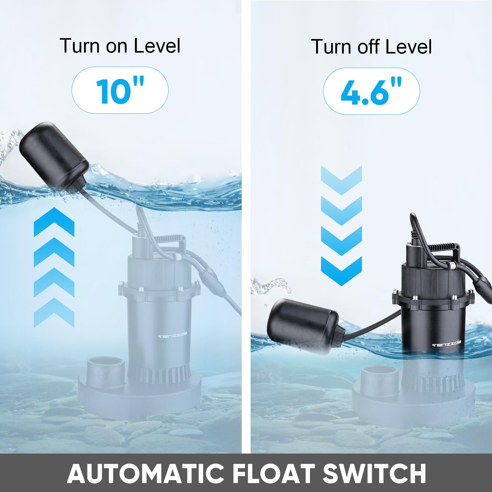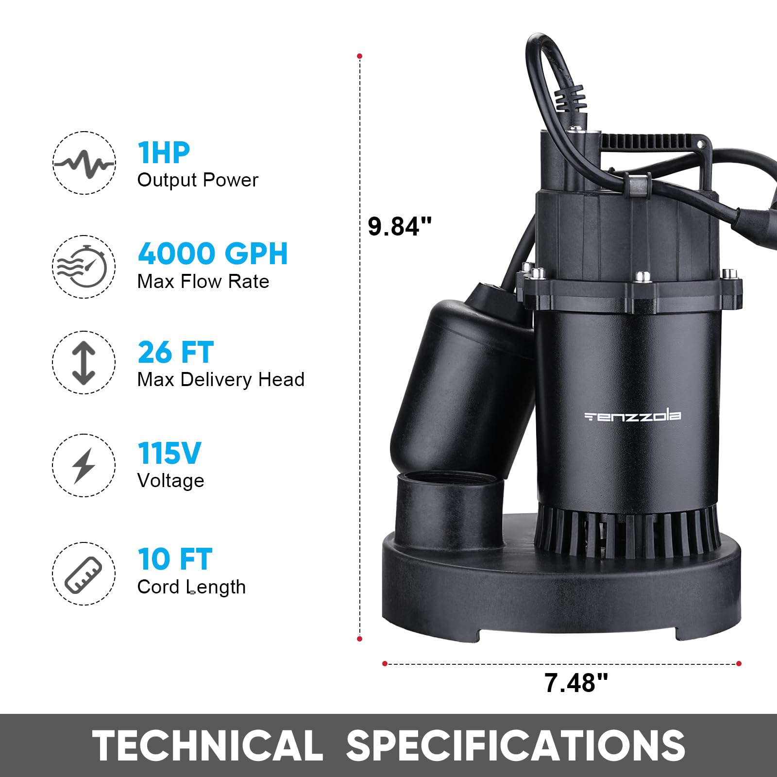 Efficient Sump Pump: The Tenzzola submersible water pump features a powerful 1HP motor, capable of draining up to 4000GPH and lifting water up to 26ft in vertical height.