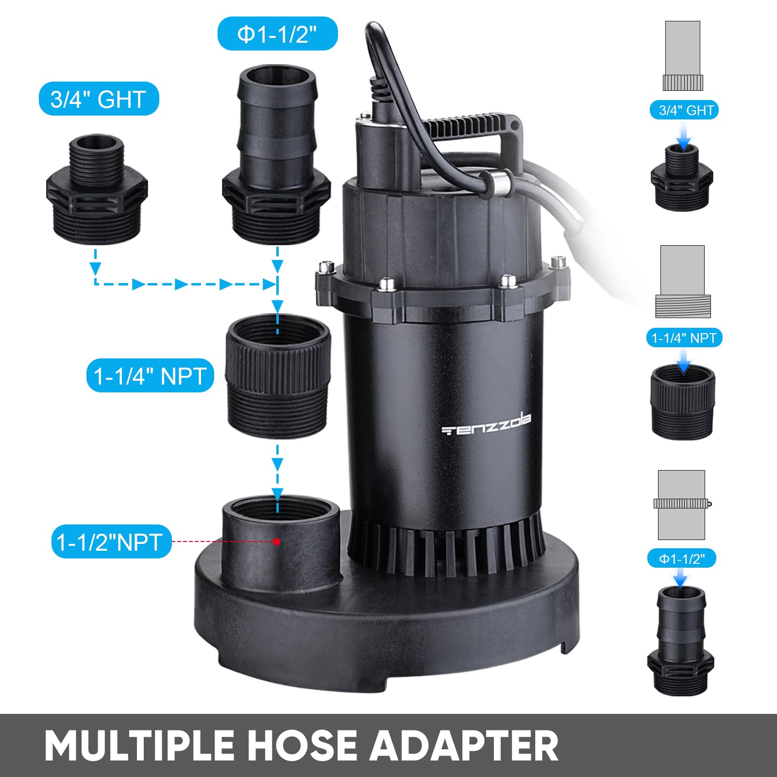 Wide Compatibility: The submersible pump with a 1-1/2"NPT discharge and includes a multi-use hose adapter compatible with 3/4" GHT, 1-1/4" NPT and 1-1/2" barbed fittings for versatile connections.