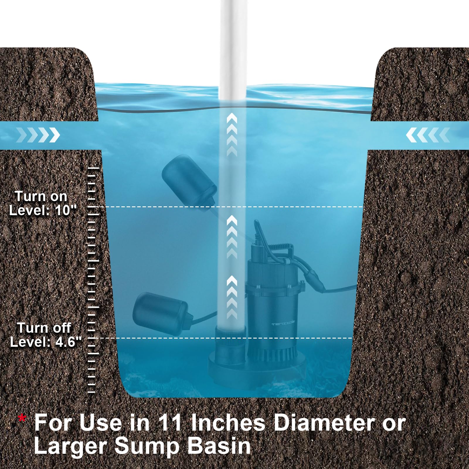 Easy to Use: The submersible sump pump features a durable float switch that automatically activates when water levels rise and turns off once water levels drop, keeping your basement dry.