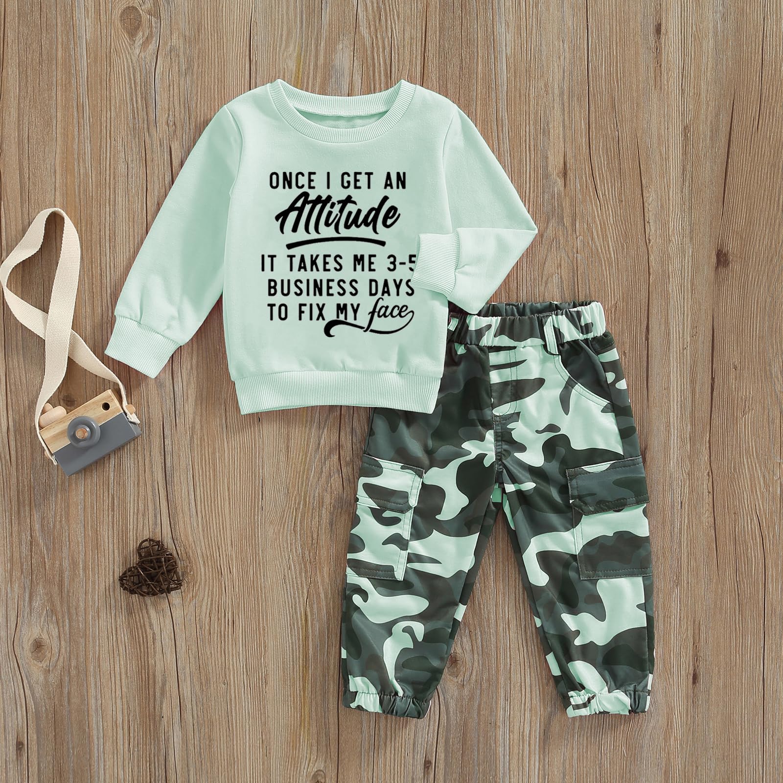 ♥Design: Baby girl fall outfits, pullover sweatshirt features letter print, long sleeves and a round neck. Trousers feature camouflage print and pockets.