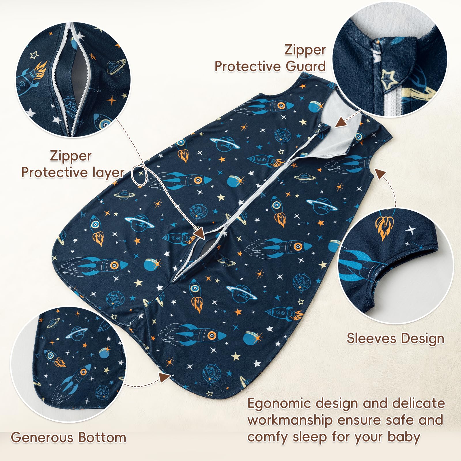 Generous Bottom Space and 2-way Zipper: Our sleeping bags have generous bottom space that allows your baby to kick and move their legs freely. The 2-way zipper makes it easy for you to change your baby's diaper. Our sleep sacks come with protective layers that prevent the zipper from accidentally scratching your baby. The sleeveless design allows free movement of your baby's arms, making it easier for them to roll over and sleep comfortably.