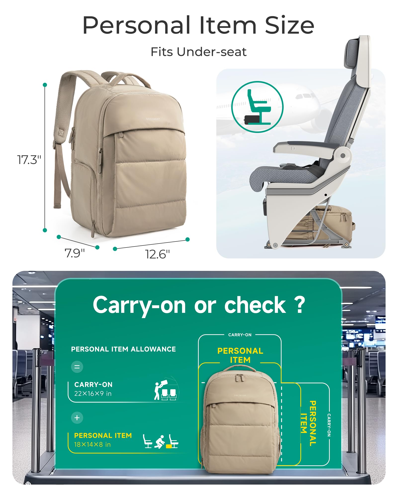 Ample Compartment: BAGSMART Travel Backpack provides generous room and diverse compartments, effortlessly segregate and store your 15.6" laptop, books, supplies. Meets airline carry-on requirements. Dimensions:17.3×12.6×7.9 inches