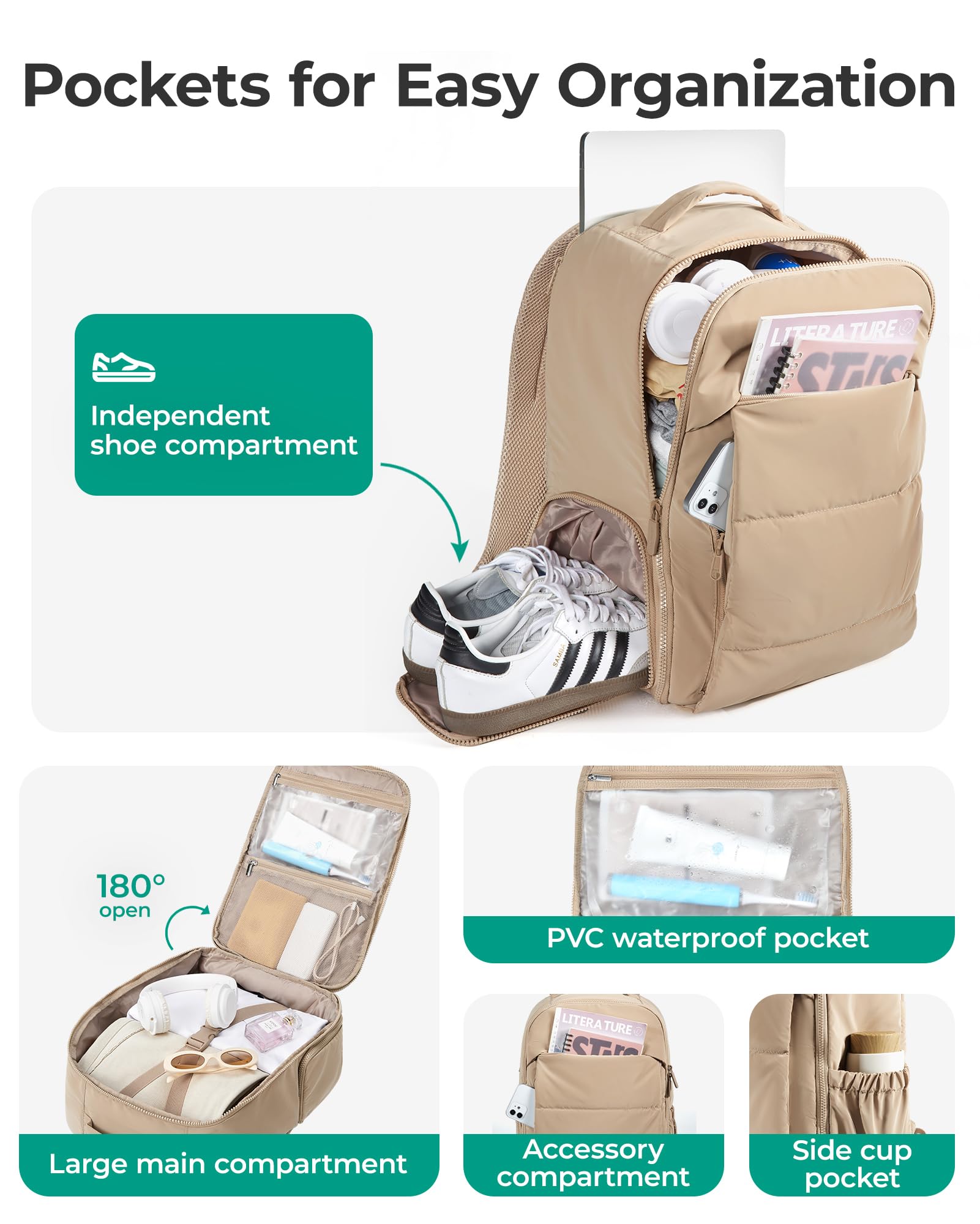 Practical Features: A separate shoe compartment on the side maintains cleanliness and organization. The Padded 15.6" laptop compartment towards the backside, keeps electronics easy to access and provides reliable protection against impacts. Additionally, the back strap conveniently fits over a suitcase handle for effortless transport