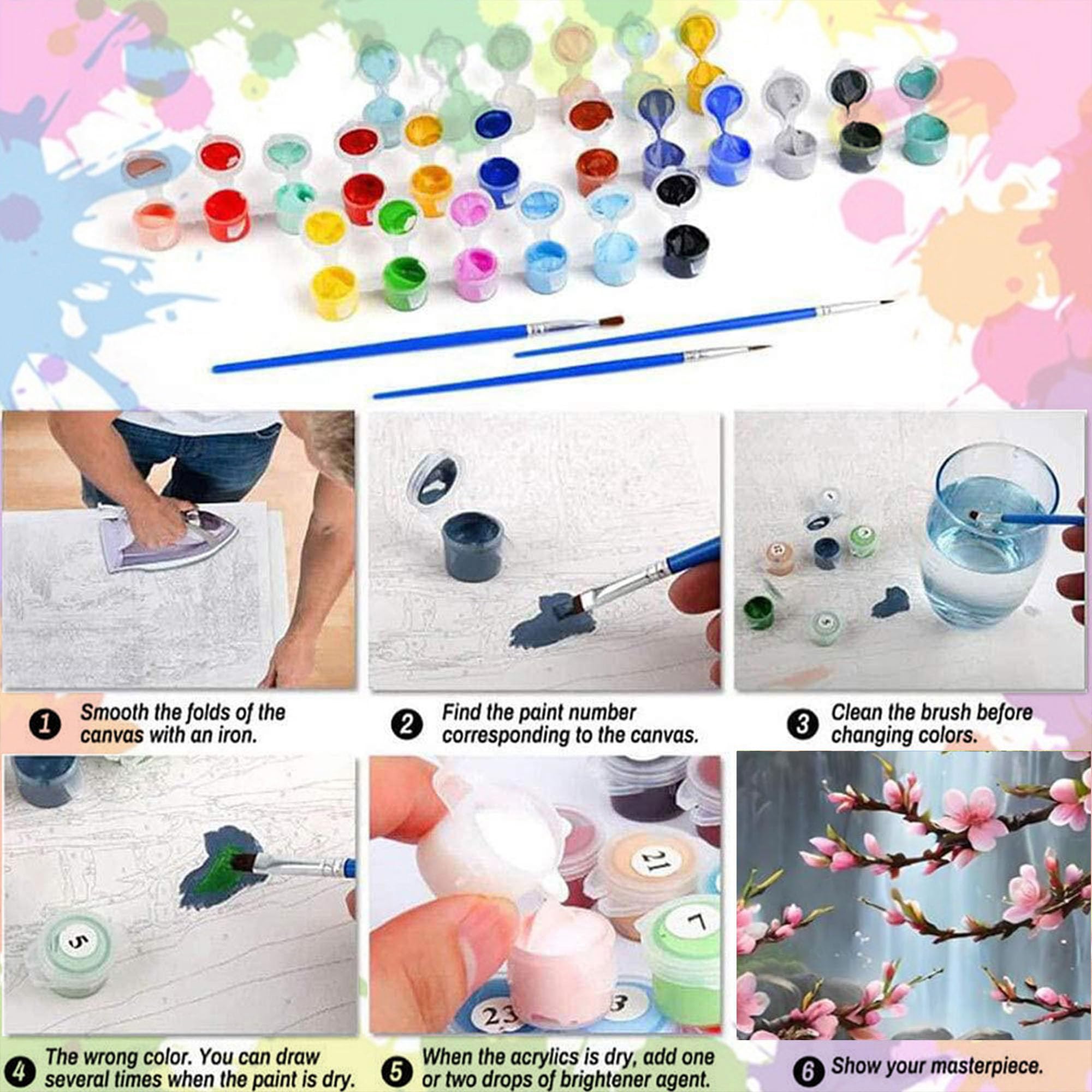 Paint by Numbers Kit for Adults:Paint by numbers for adults included 1x textured canvas (no frame),3x high quality brushes,1x set of acrylic paint,1x numbered reference canvas and 2x metal hooks.All tools are prepared,you can paint directly