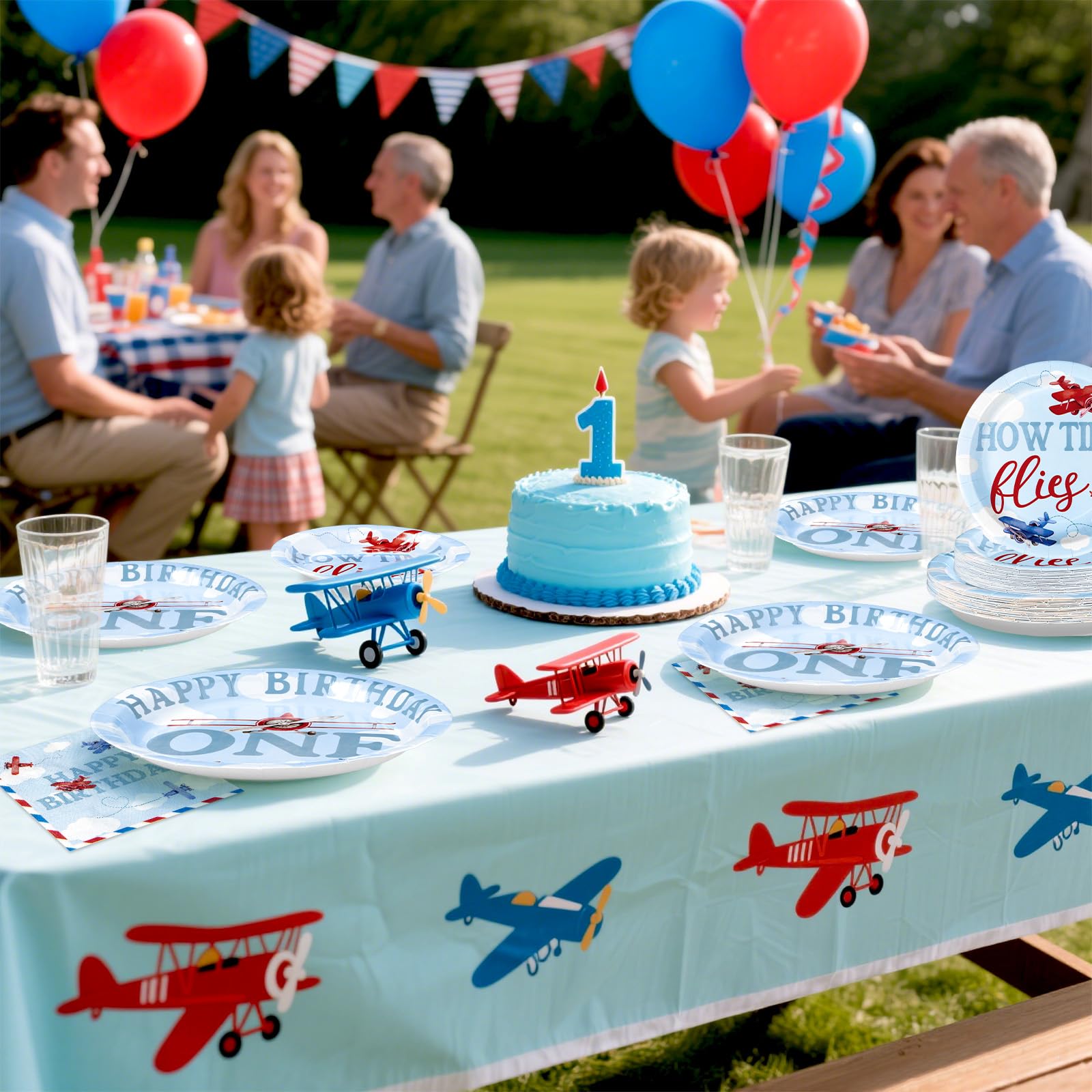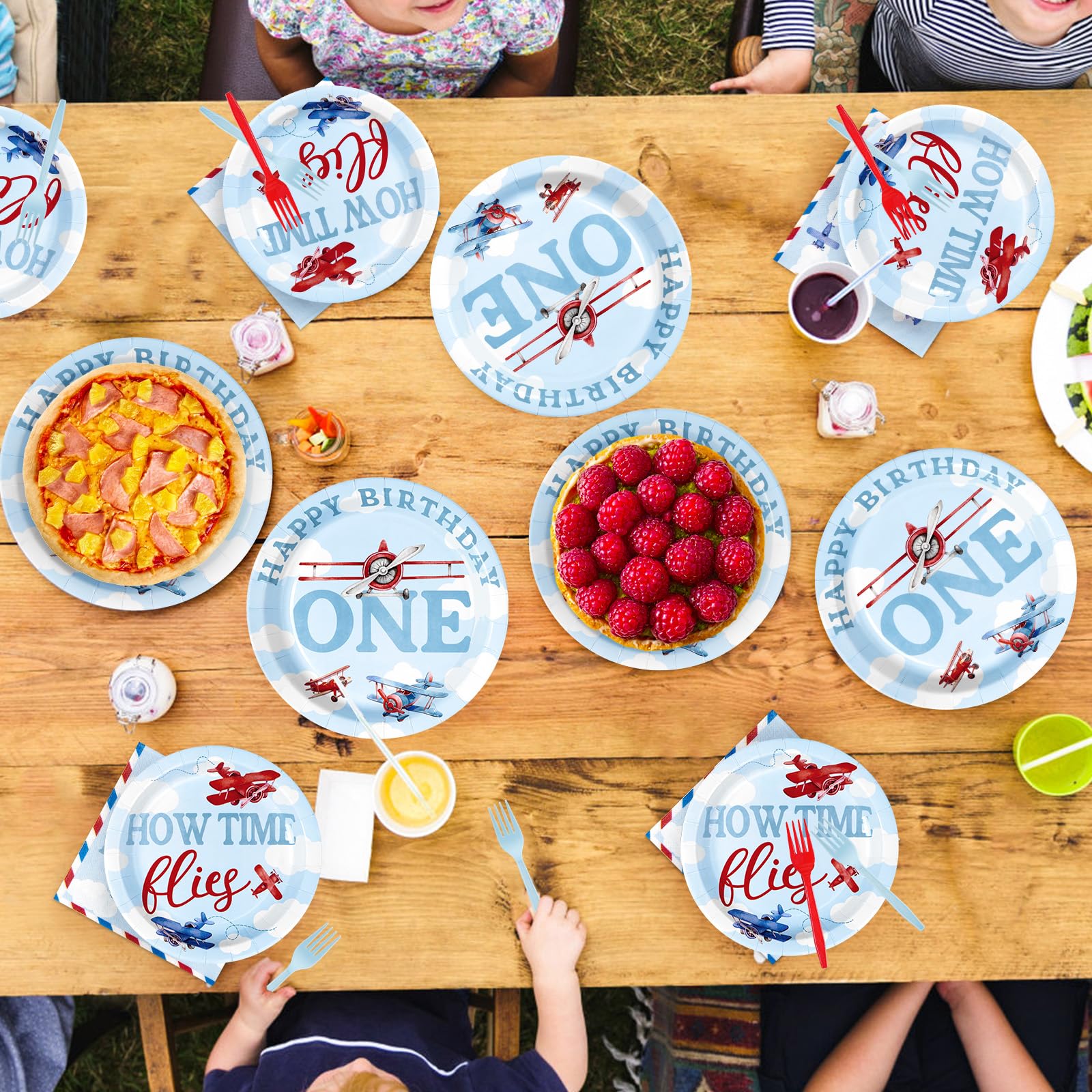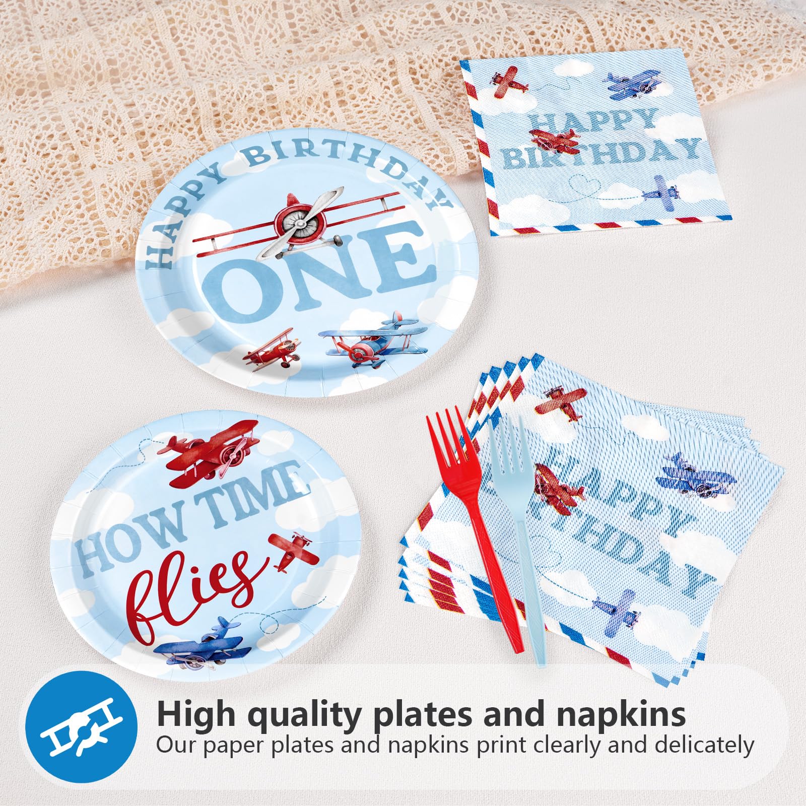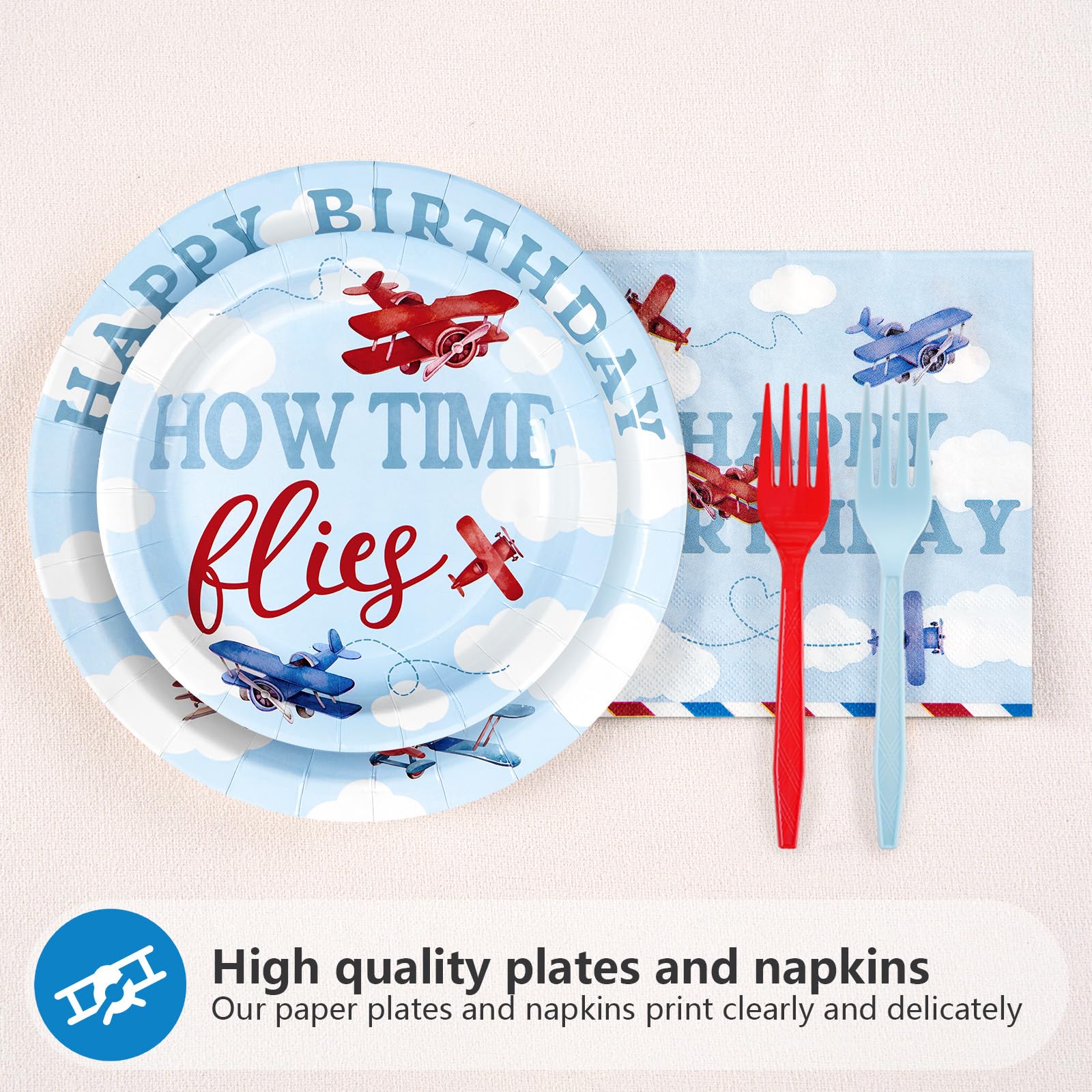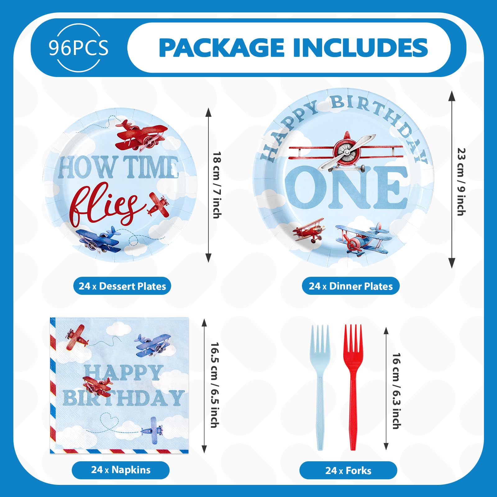 【Time Flies 1st Birthday Decorations 】Vintage airplane first birthday party decorations flatware set includes 24pcs 9''airplane dinner plates, 24pcs 7'' airplane dessert plates, 24pcs airplane napkins, 24pcs disposable forks.There are a total of 96 pieces in thistime flies boy 1st plates and napkins set,everything you need to serve up to 24 guests in style.The vintage airplane party supplies enough to hold a different and unique party