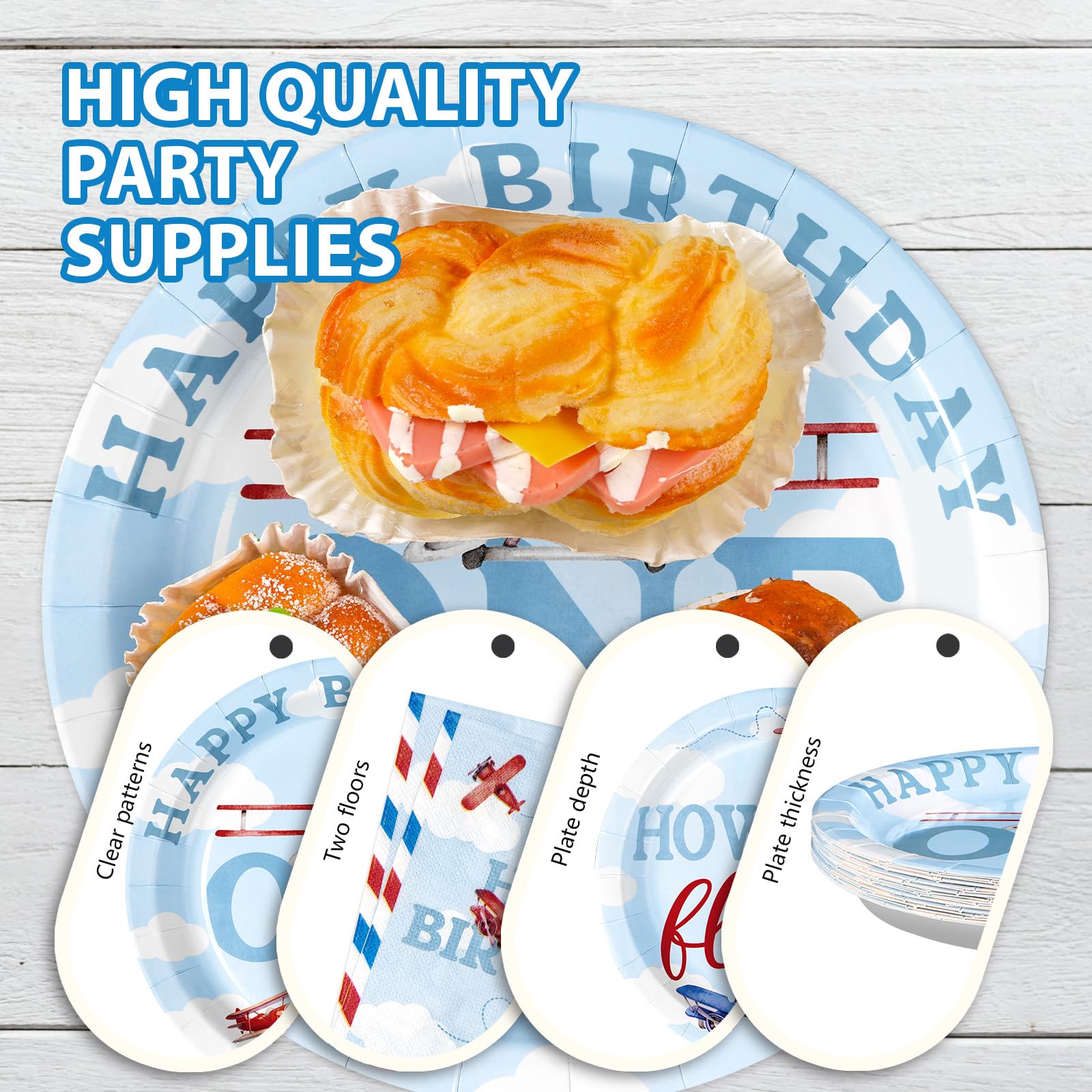 【Upgraded Material】Our airplane 1st birthday party plates is made of high quality thick paper, upgraded 350g weight is more sturdy and not easy to bend. The napkin is 2-ply, soft and absorbent, not easy to tear. The fork is made of high quality plastic, not easy to break. police pattern is beautifully printed and not easy to fade. High-quality materials ensure you enjoy the party smoothly and worry-free! (Tip: Please do not microwave the plates.)