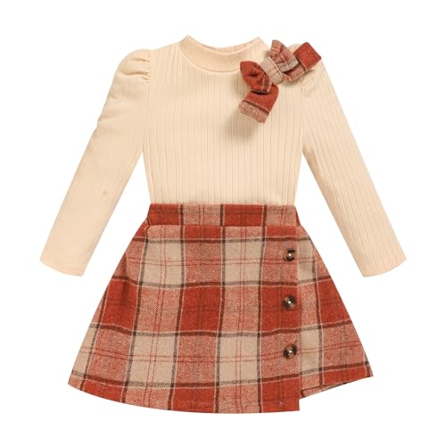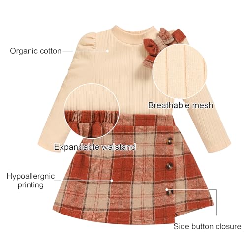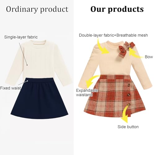 MATERIAL: Toddler girl shirt sweater top is made of cotton and polyester, bottom skirt is made of cotton blend and polyester, soft, breathble, and comfortable, sweet toddler baby girl 2 piece skirt set, cute baby girl clothes.
