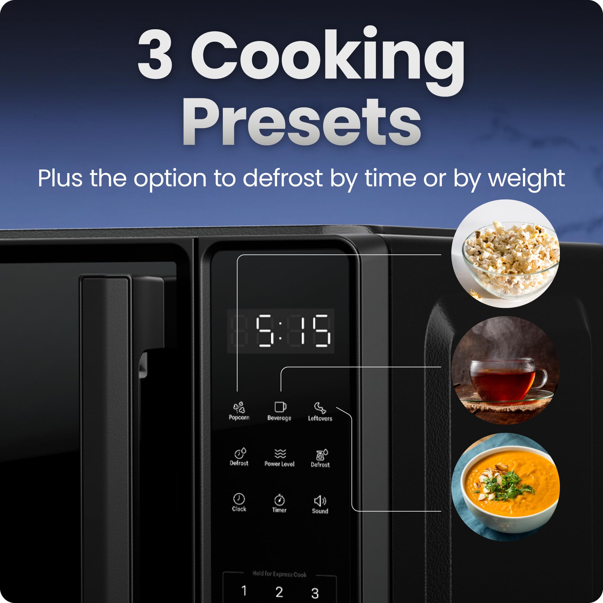 EXTRA-QUICK COOKING: Choose from six popular presets for microwave ovens, including popcorn, pizza, beverages, veggies, potatoes, or leftovers. Or just press the number keys to quickly set the cook time for that number of minutes.