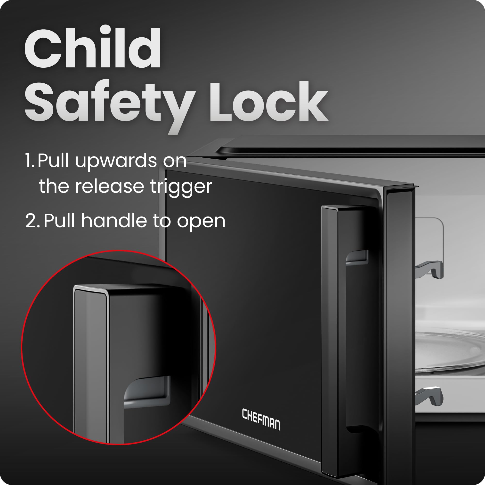 SAFETY FIRST: The built-in child safety lock on the handle ensures the door doesn’t open accidentally. Just pull upwards on the top edge of the handle to open the microwave.