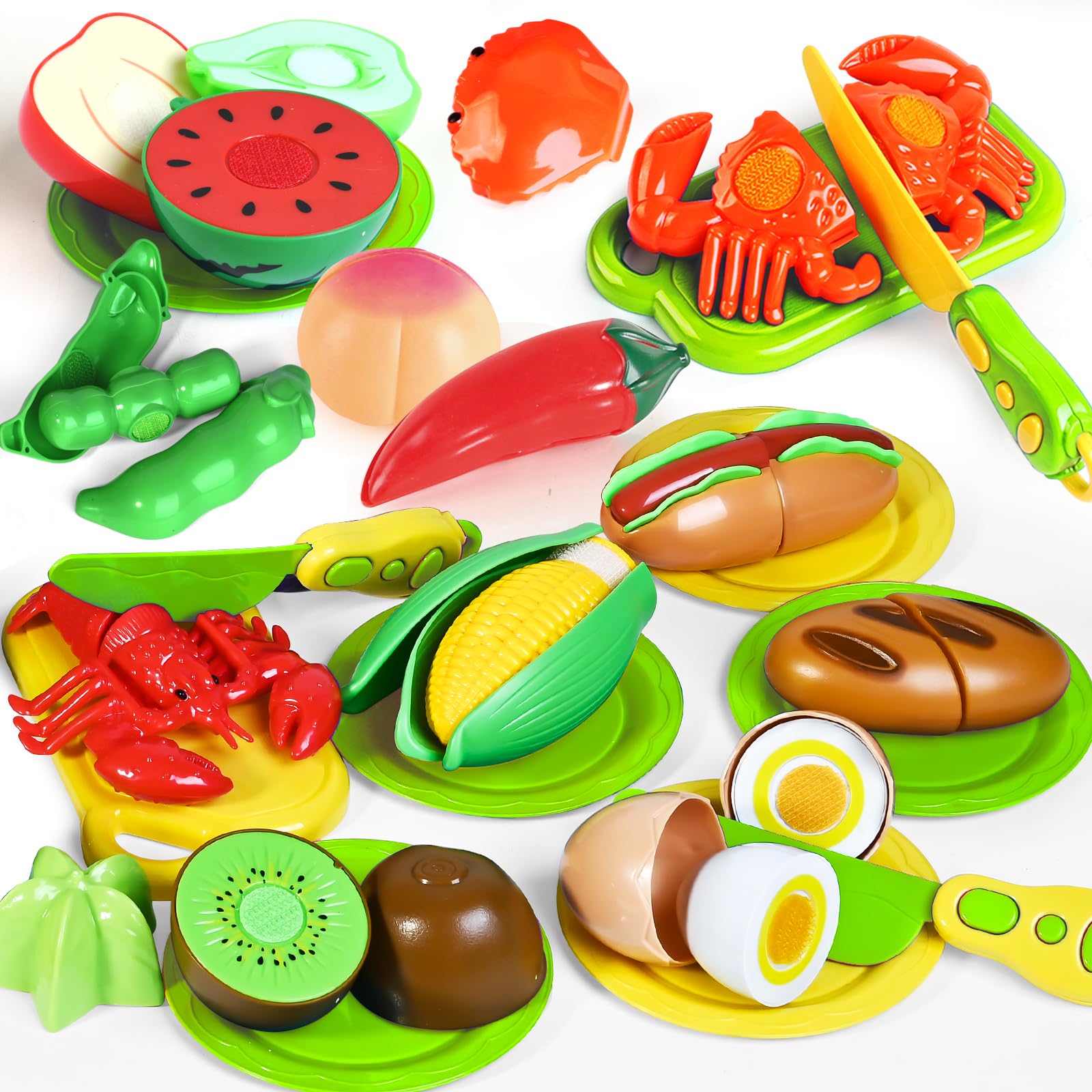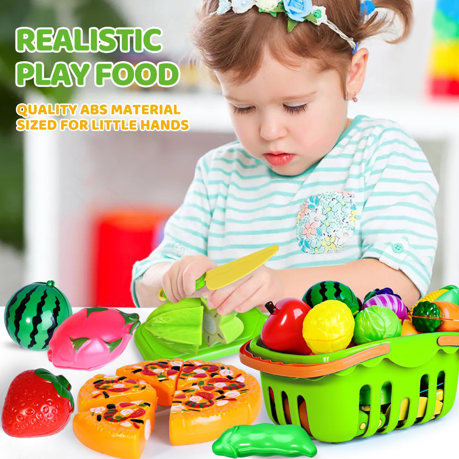 wesome Educational Toys Gifts for Kids: Cutting play food set are an excellent early education toys for toddler kids. Bright colors can not only attract the toddler's attention, but also improve color perception. Help toddlers to know and recognize a variety of foods fruit and vegetables, improve kid's imagination, hand-eye coordination, fine motor skill and counting ability! Great educational gifts for toddlers girls boys age 12 3 4 5