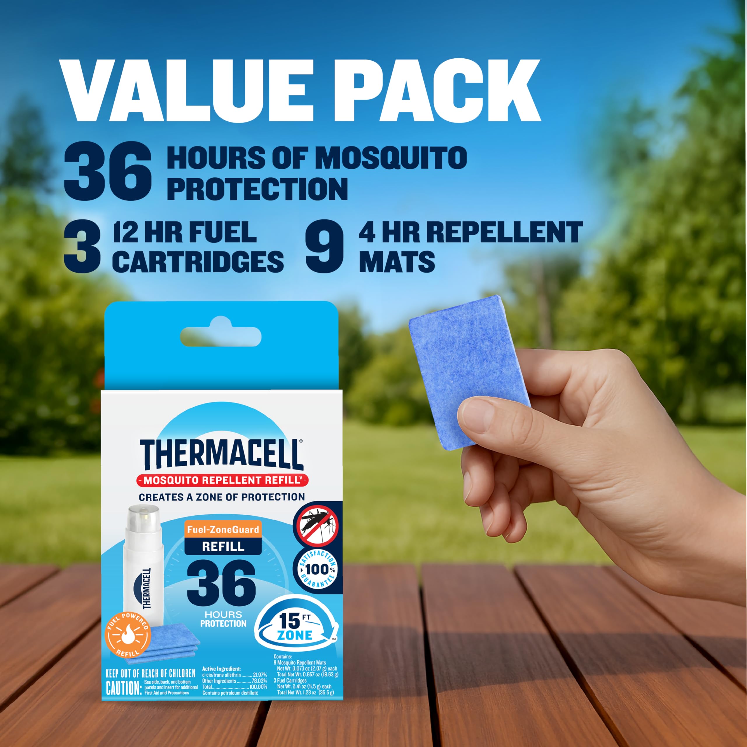 EFFECTIVE MOSQUITO REPELLENT FORMULA: Thermacell Mosquito Repellent creates a 15-foot zone of protection against mosquitoes. This 36-hour refill pack is compatible with all fuel-powered Thermacell repellers (except the Backpacker).