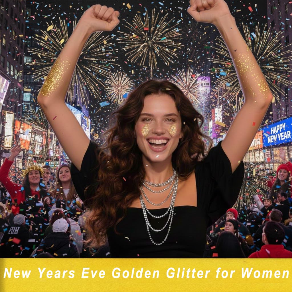 Happy New Year Glitter Makeup --- MEICOLY gold face glitter gel is rich in glitter sequins that mixed with different shape of holographic sequins,the color and shine of the laser sequins vary with the perspective,like a rainbow,perfect festival outfits accessories for women,providing you with glitter effect at New Years Eve, mardi gras,st patricks day,country music festival and other more musical event.