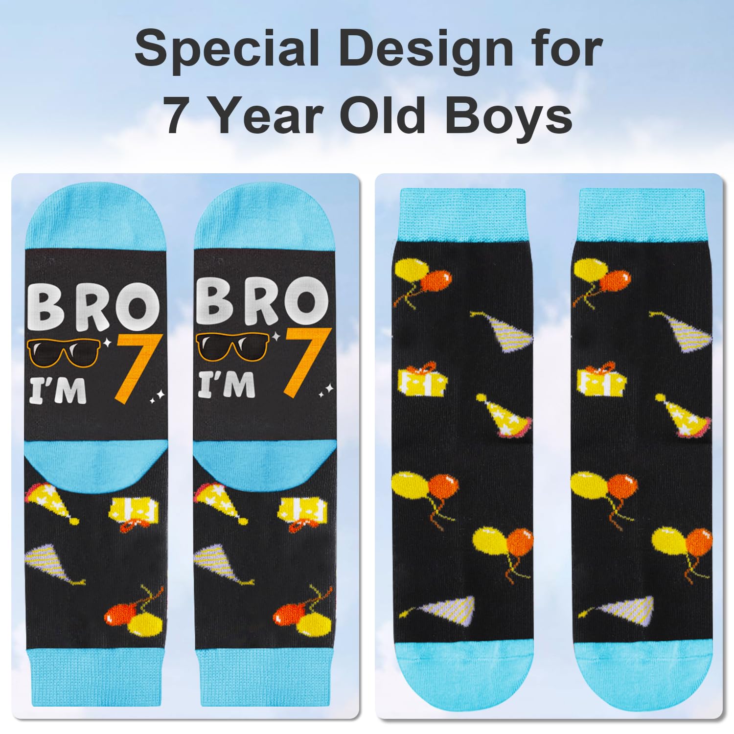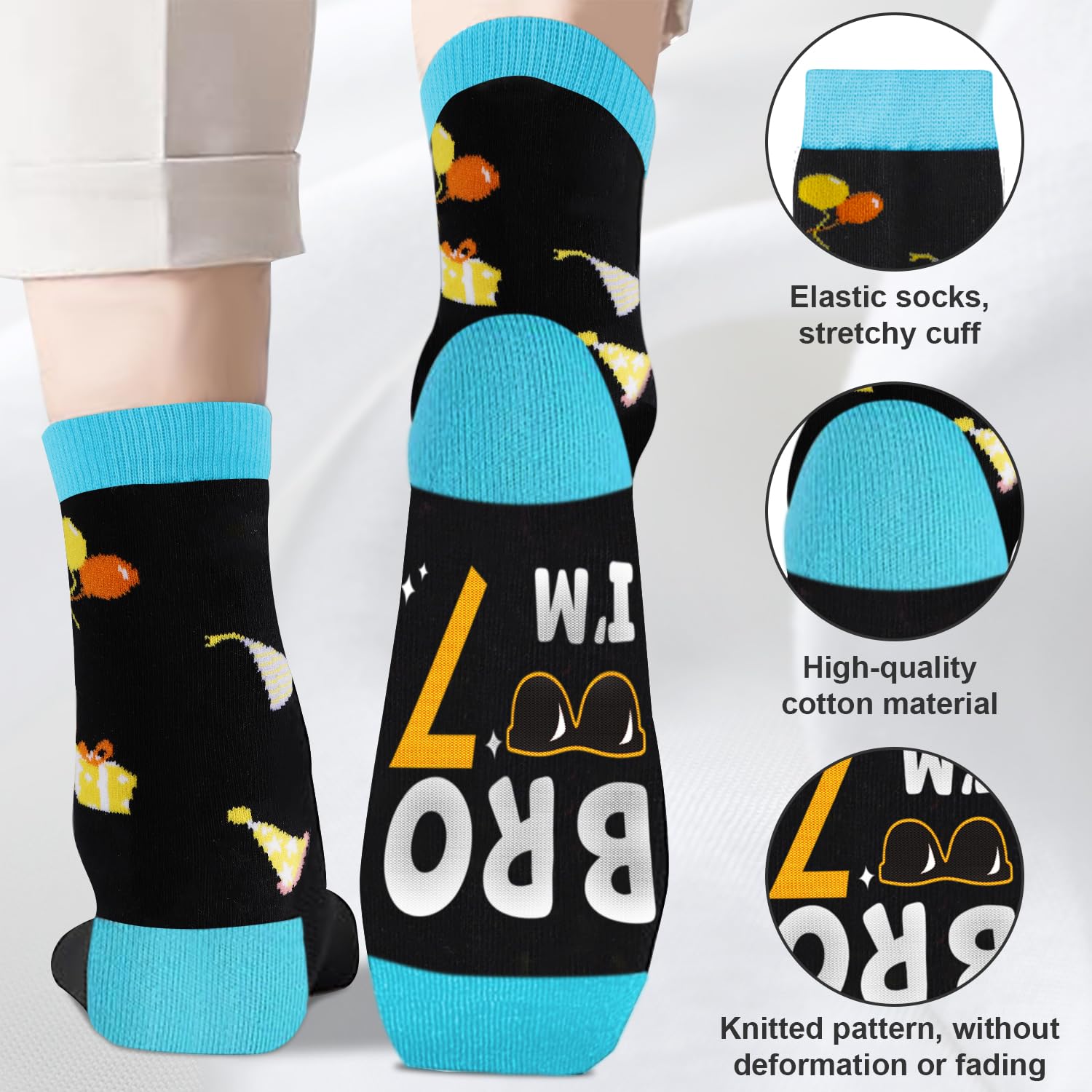 Socks for 7th Birthday Boys Design: Our socks are predominantly black, blue, orange and white, eature birthday gifts, balloons, cakes, and other birthday elements on the top, while the bottom is sewn with a hilarious hidden message: "BRO I'M 7." the young and energetic design, Suitable for 7th Birthday Gifts, Christmas Gifts, New Years Gifts or White Elephant Gifts