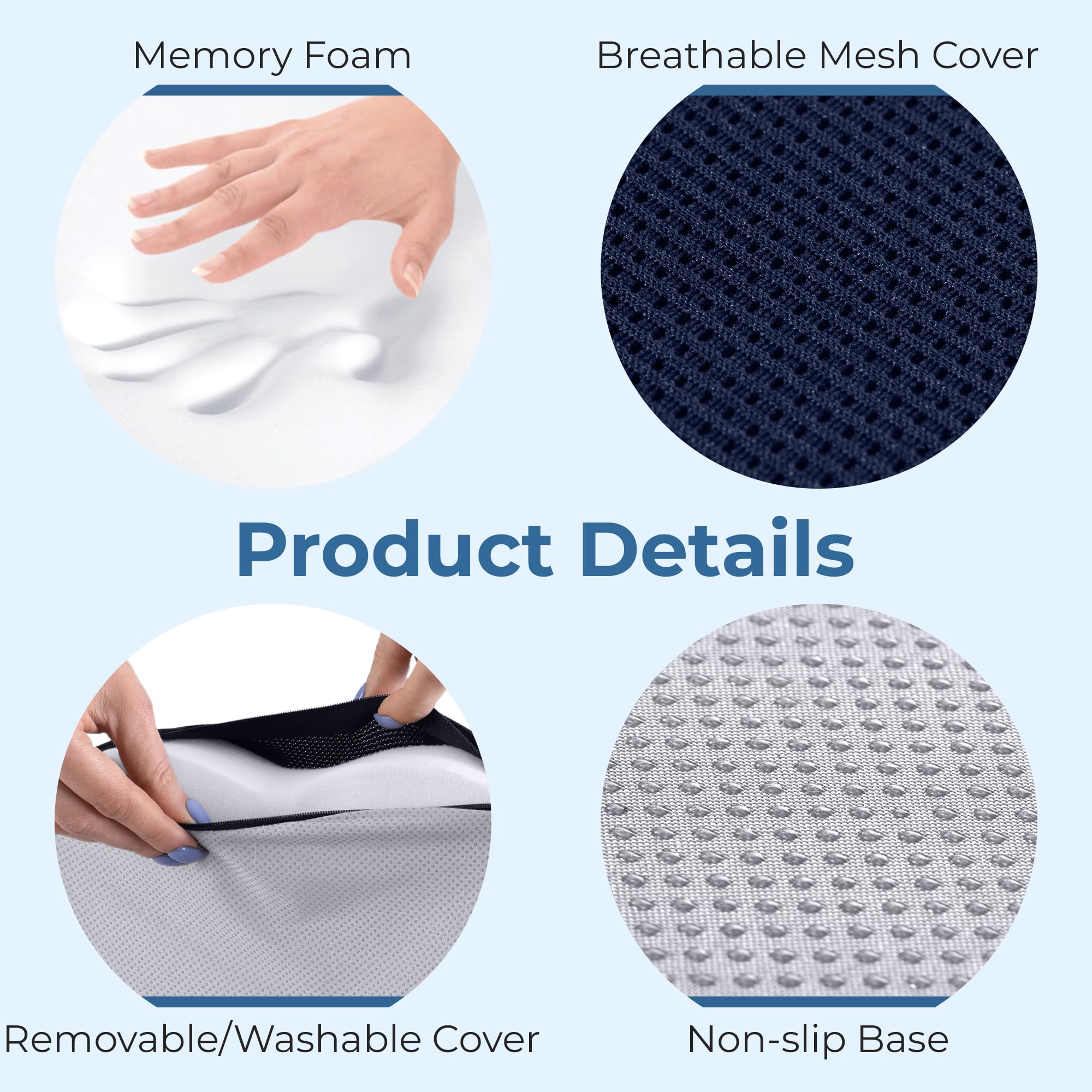 𝗛𝗶𝗴𝗵 𝗤𝘂𝗮𝗹𝗶𝘁𝘆 𝗖𝗵𝗮𝗶𝗿 𝗣𝗮𝗱 - Measuring 17.7"x 13.8"x 2.8", the butt support pillow comes with a removable and breathable black mesh cover, that provides great air circulation and allows you to sit without feeling hot or sweaty. The non-slip rubber base of the pad securely keeps it in place. The cushion insert is made from Slow Rebound Memory Foam that conforms to your individual shape and helps to avoid pressure. The handle is attached to the side of the pillow, making it easy to take it with you