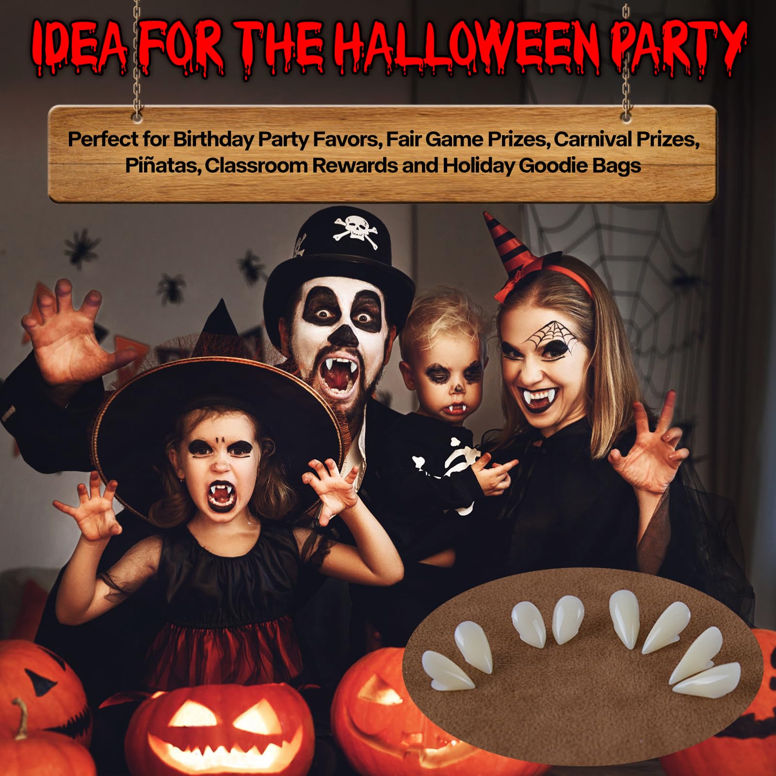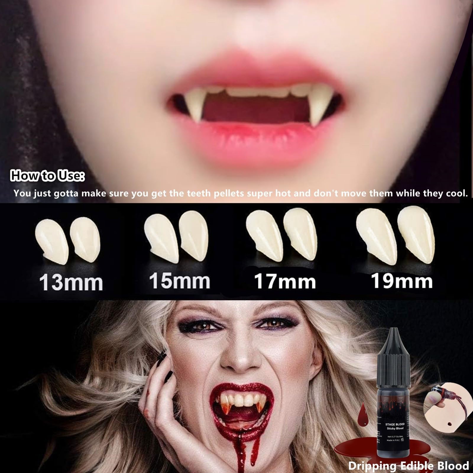 【A Set of Vampire Fangs Teeth Dentures Props】Vampire fangs teeth 4 sizes for Halloween Decorations Party Cosplay Props, 4 pairs Vampire Fangs Fake Teeth with adhesive white favors accessories gift.It is good for Halloween Vampire cosplay makeup. DIY Cosplay Props False Teeth Resin Fangs with Solid Glue.Non-toxic and safe on teeth.4 pairs vampire fangs teeth including 4 sizes 13 mm, 15 mm, 17 mm, 19 mm, and 1 tube solid adhesive (disposable) are provided for you.