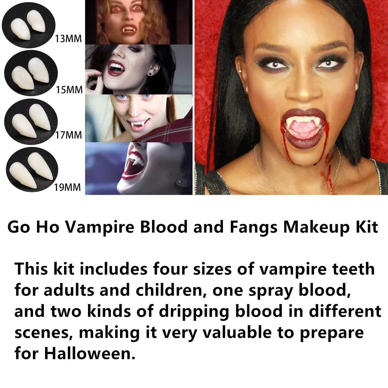 【Halloween Vampire Makup for Creating Horrible Scenes】The effect of creating blood drops is very realistic.Used with fake scar wax or liquid latex to shape the look you want.A must for Halloween Vampire Makup.Note: fake blood can washable by soap and warm water easily.This kit includes four sizes of vampire fangs teeth for adults and children, one spray blood, and two kinds of dripping blood in different scenes, making it very valuable to prepare for Halloween.