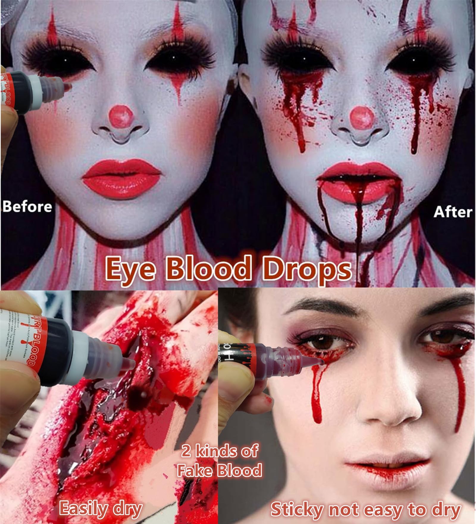 【Realistic effects Dripping Edible Blood and Fake Blood for Eye Drops】The texture and color of the drip blood bottle are specially designed to simulate realistic blood effects with a vivid and viscous appearance. This makes it an ideal choice for creating terrifying, thrilling, or attention-grabbing character makeup effects.The Dripping Blood has 2 kinds :one is sticky edible blood and keep fresh long,the other is creating a range of realistic old wound looking which will easily dry.Great for eye drops blood.