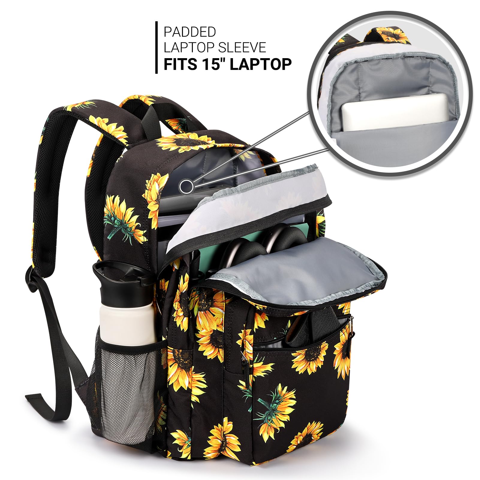 Convenient Storage Backpack: Our unisex laptop backpack features two main compartments, including a dedicated laptop sleeve for up to 15.6" devices. It also boasts a discrete front stash pocket, a utility pocket with an integrated organizer, and an additional external zippered pouch for quick access. Plus, two side pockets accommodate various water bottle sizes.