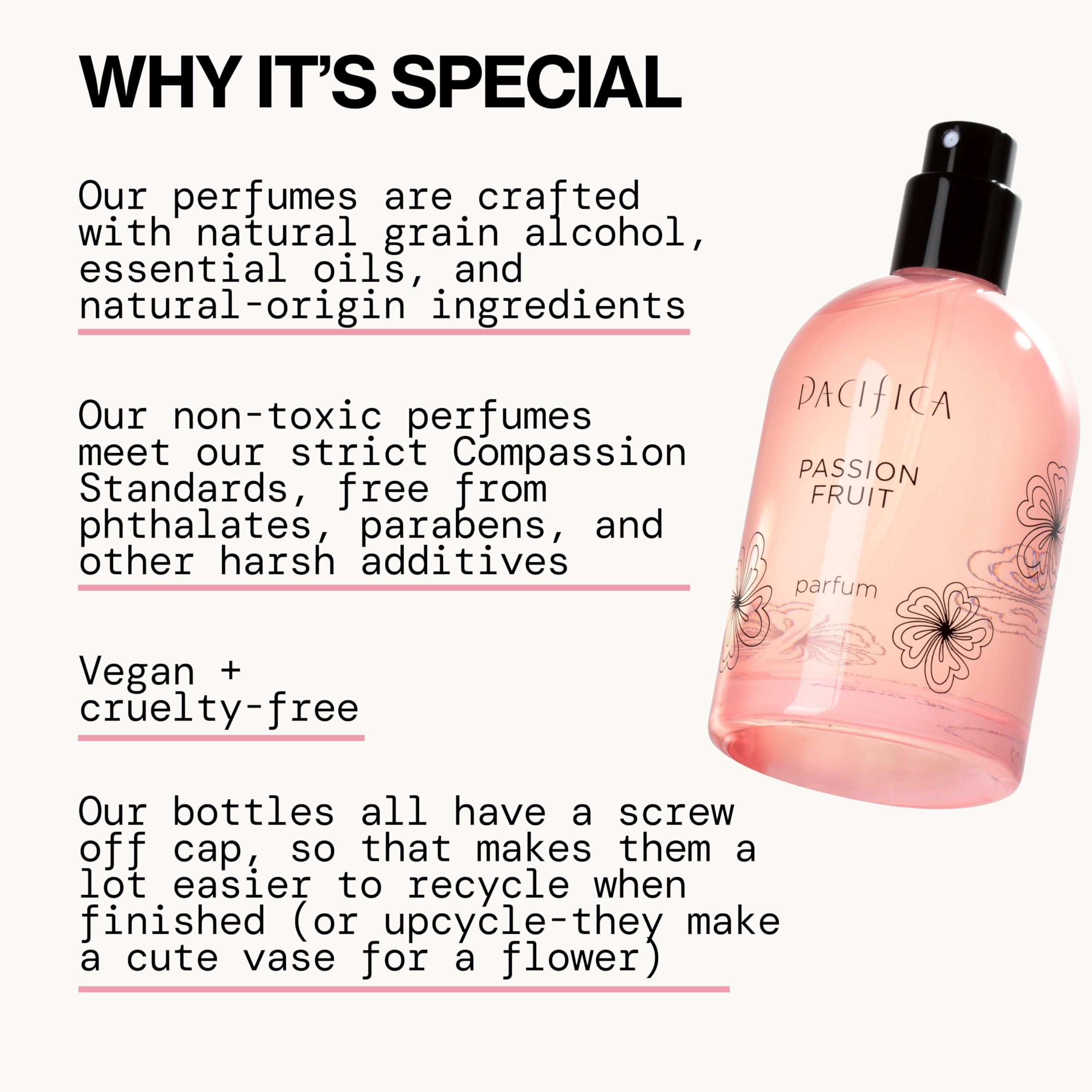 Meet Your Tropical Escape: Discover a perfume that instantly transports you to an island paradise. Pacifica's Passion Fruit Spray Perfume is an energizing fusion of fruity, tropical notes and soft sweetness, designed to spark joy with every spritz. This fragrance is like a vacation in a bottle – vibrant, juicy, and mood-enhancing. Fragrance Notes: Top: Passion Fruit, Pineapple, Bergamot, Watermelon Middle: Orange Blossom, Rose, Ginger Base: Sandalwood, Vanilla, Musk These layers create a bright, exotic scent journey – from sparkling fruity-citrus top notes to a lush floral heart, grounded by a warm gourmand base. The result is a fresh sweet scent that evolves beautifully on the skin throughout the day. Mood-Boosting Aroma: More than just a fragrance, this perfume is a daily dose of happiness. Formulated as part of Pacifica’s Aromapower lineup, it's backed by neuroscience to help uplift your mood. The joyful blend of tropical fruits and gentle florals serves as aromatherapy you can wear, inspiring positivity and a sense of escape. Clean, Vegan & Non-Toxic: Embrace a clean beauty fragrance. Our Passion Fruit Perfume is 100% vegan and cruelty-free, made with sustainably sourced natural and essential oils in a base of natural grain alcohol. We steer clear of harmful ingredients – free from phthalates, parabens, propylene glycol, polycyclic musks, and other toxic nasties – so you can indulge daily without worry. Sustainable Luxury: Enjoy an eco-conscious scent packaged with the planet in mind. Pacifica’s glass perfume bottle is designed for easy recycling – simply unscrew and remove the pump, and recycle the glass when empty:contentReference[oaicite:0]{index=0}. The carton is made from FSC certified paper, reflecting our commitment to the environment from formula to packaging. Indulge in a little luxury that’s guilt-free and sustainably crafted. Long-Lasting & Layerable: Although bright and airy, this tropical fragrance has impressive staying power. A few sprays in the morning and the uplifting passion fruit and pineapple notes will carry you through a busy day. The scent wears evenly and lingers subtly, drawing compliments without overwhelming. Love to get creative with your fragrances? Layer this perfume with other scents (try vanilla, coconut, or citrus perfumes) to create your own custom blend. Its balanced profile plays well with others, making it a perfect base for layering and experimenting. Anytime Summer Vibes: Whether you're heading to work, hitting the beach, or simply need a pick-me-up, this perfume is your go-to for an instant mood lift. It's especially suited for daytime wear – think brunches, picnics, and casual outings – but also adds a fun twist to evenings out, thanks to its yummy gourmand dry-down. Women of all ages adore this scent for its playful yet sophisticated character. If you enjoy perfumes that are fruity and sweet (but not overpowering), Pacifica Passion Fruit can easily become your signature scent. It's like wearing a smile – bright, carefree, and contagious. Join the Tropical Fragrance Trend: Tropical, beach-inspired perfumes are more popular than ever, and this scent captures that vibe perfectly. It proves you can have an exotic, vacation-worthy fragrance that's also clean and consciously crafted. Fans of tropical fruity scents will find something to love here – but in a cleaner, greener formula. Embrace the island vibes and make every day feel like summer with Pacifica Passion Fruit Spray Perfume!