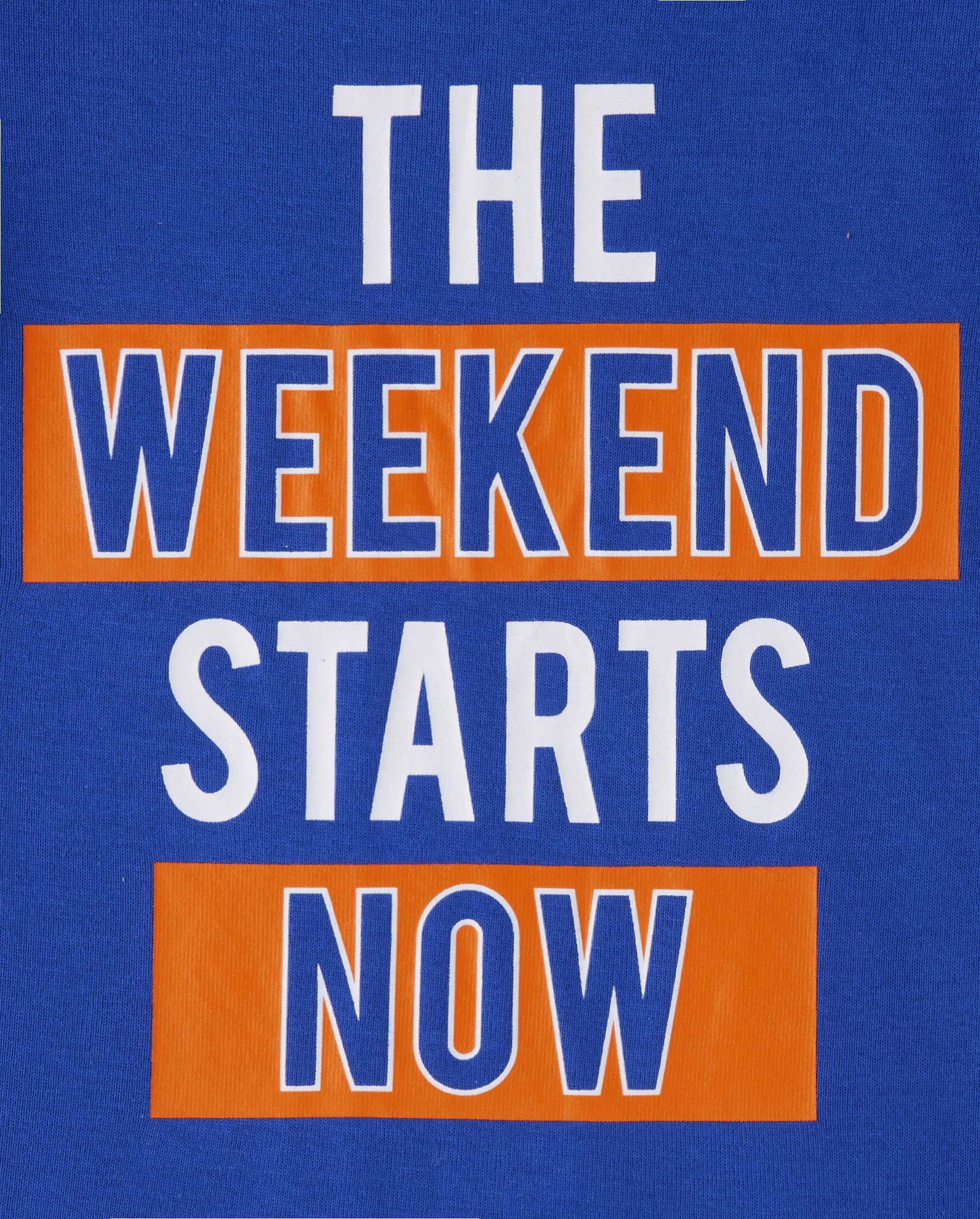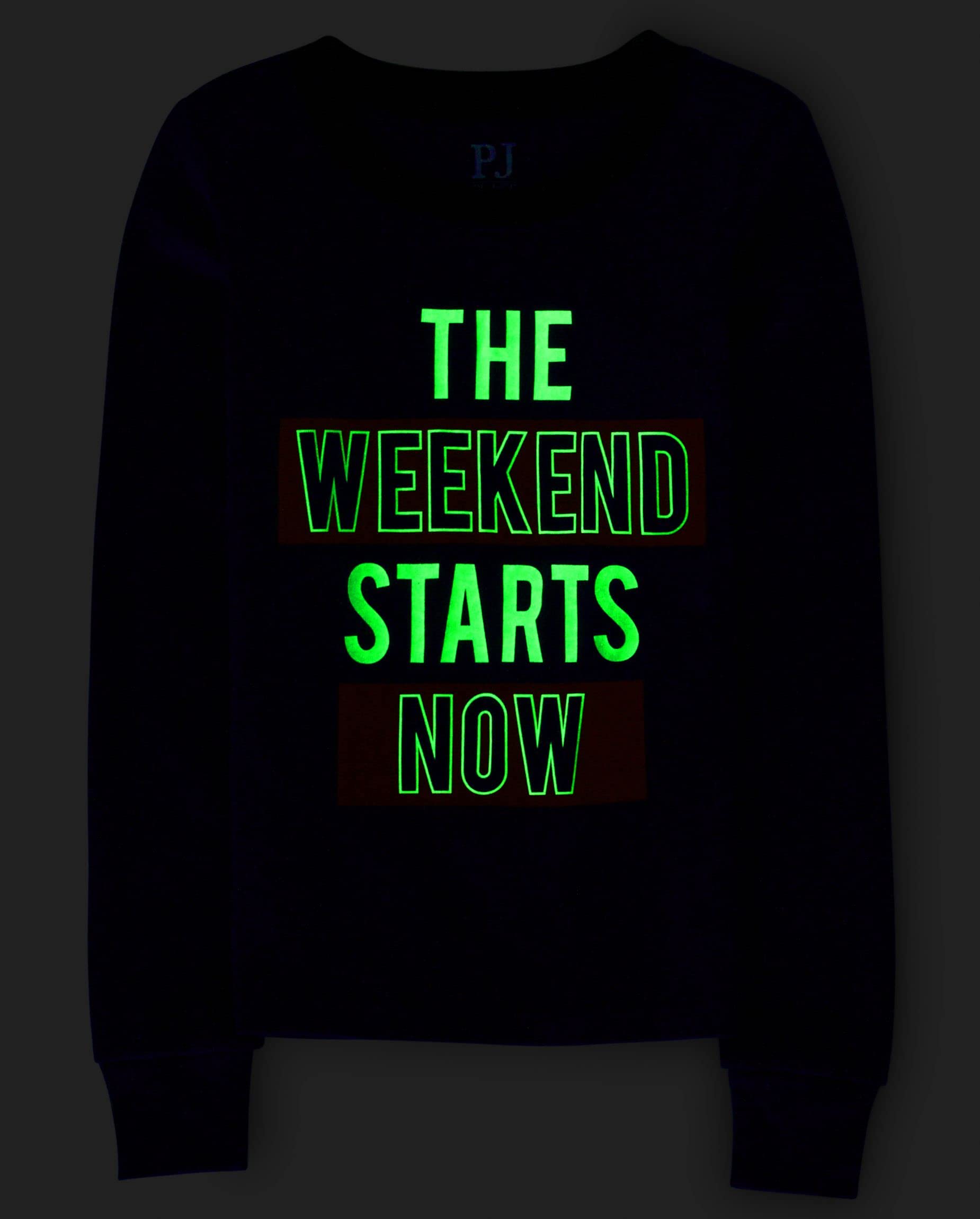 PAJAMA TOP — Features long sleeves, rib-knit crew neck and sleeve cuffs and 'The Weekend Starts Now' graphic design at front glows in the dark. For best glow effect, expose to light before wearing