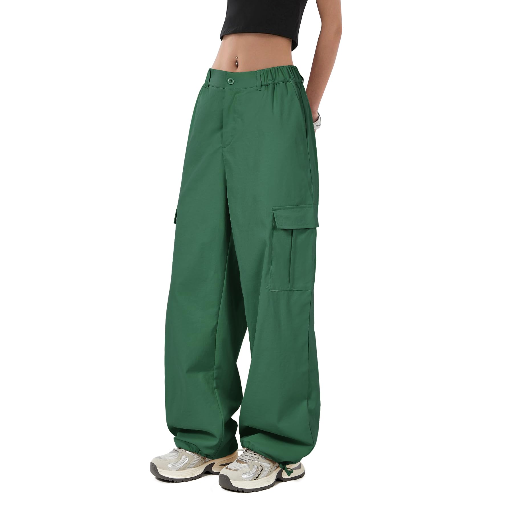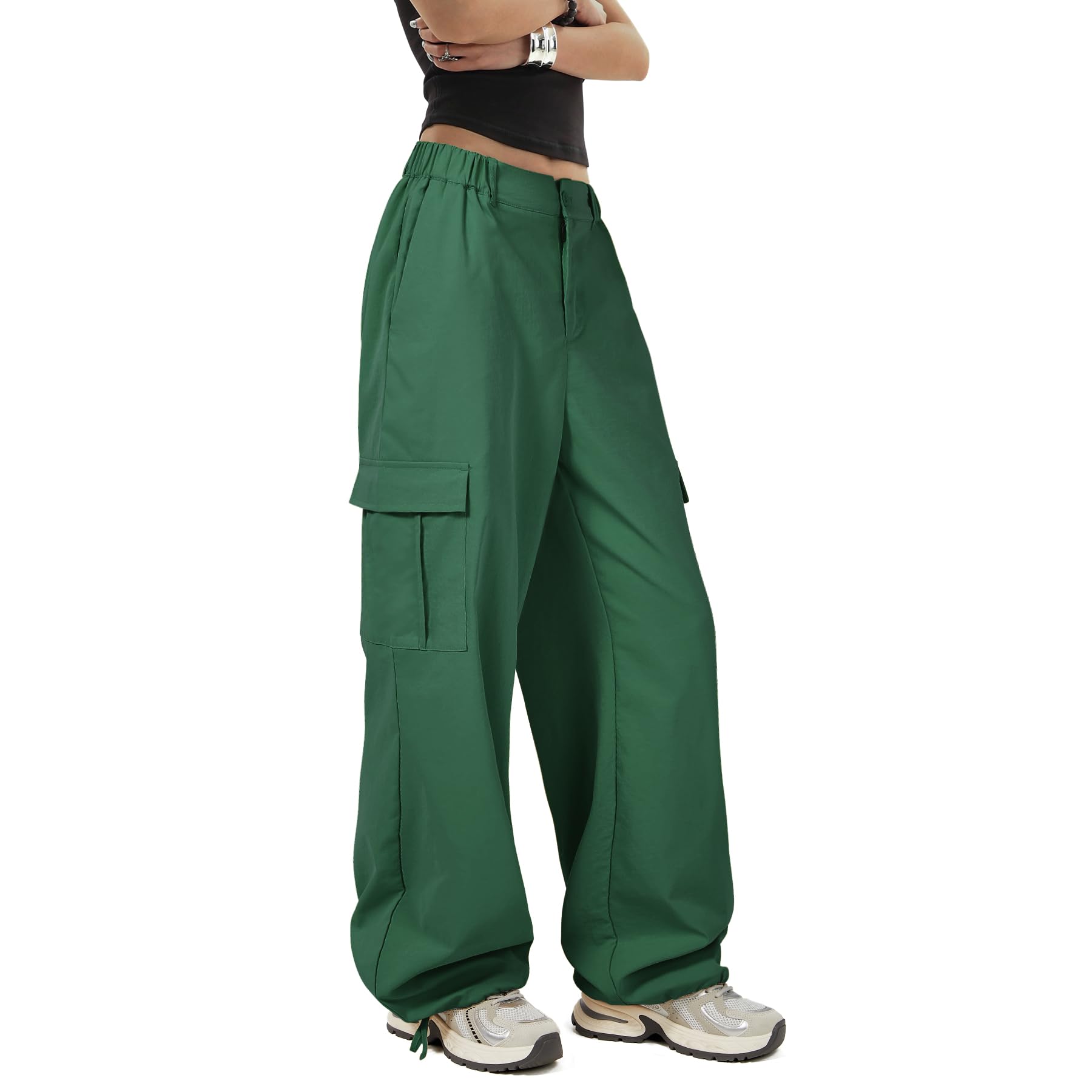 Baggy Parachute Pants : The white cargo pants are slightly sheer, opt for black if you prefer. Size S gives a relaxed fit—petite or slim girls should consider sizing carefully. For the model's look in size M, we recommend sizing up. These women's loose high-waist cargo pants feature an elasticized waistband, flattering all body types. Adjustable drawstrings at the hem offer two styling options, creating versatile Y2K-inspired streetwear vibes.