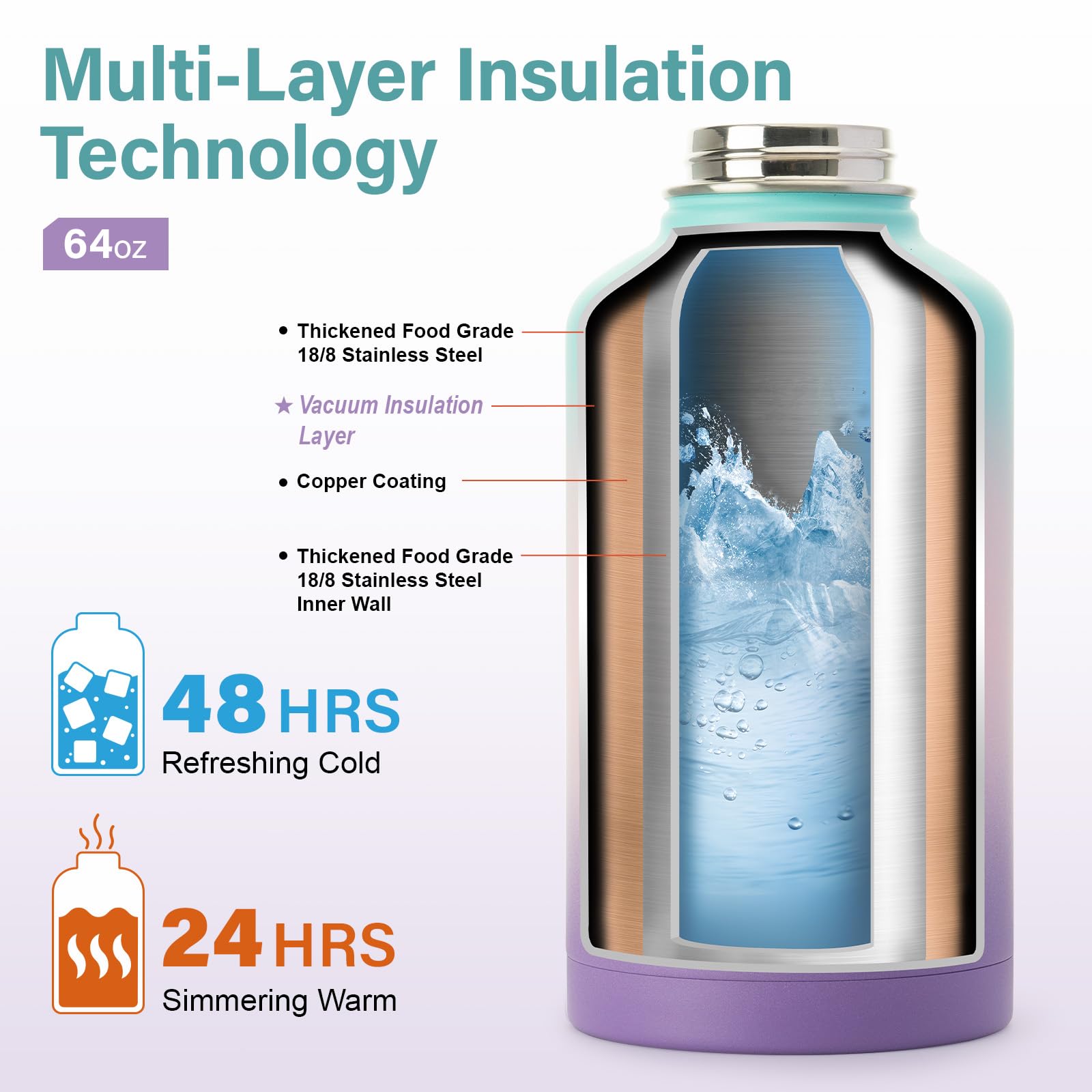 THE MULTI-LAYER INSULATION TECHNOLOGY FEATURES: the first layer is a thick food-grade 18/8 stainless steel inner wall; the second layer has a copper plating that reduces heat transfer; the third layer is a vacuum layer that prevents heat loss. As a result, you can enjoy an insulated water bottle that keeps beverages cold for up to 48 hours and hot for up to 24 hours, making it perfect for any adventure, whether it's a long hike or a busy workday.