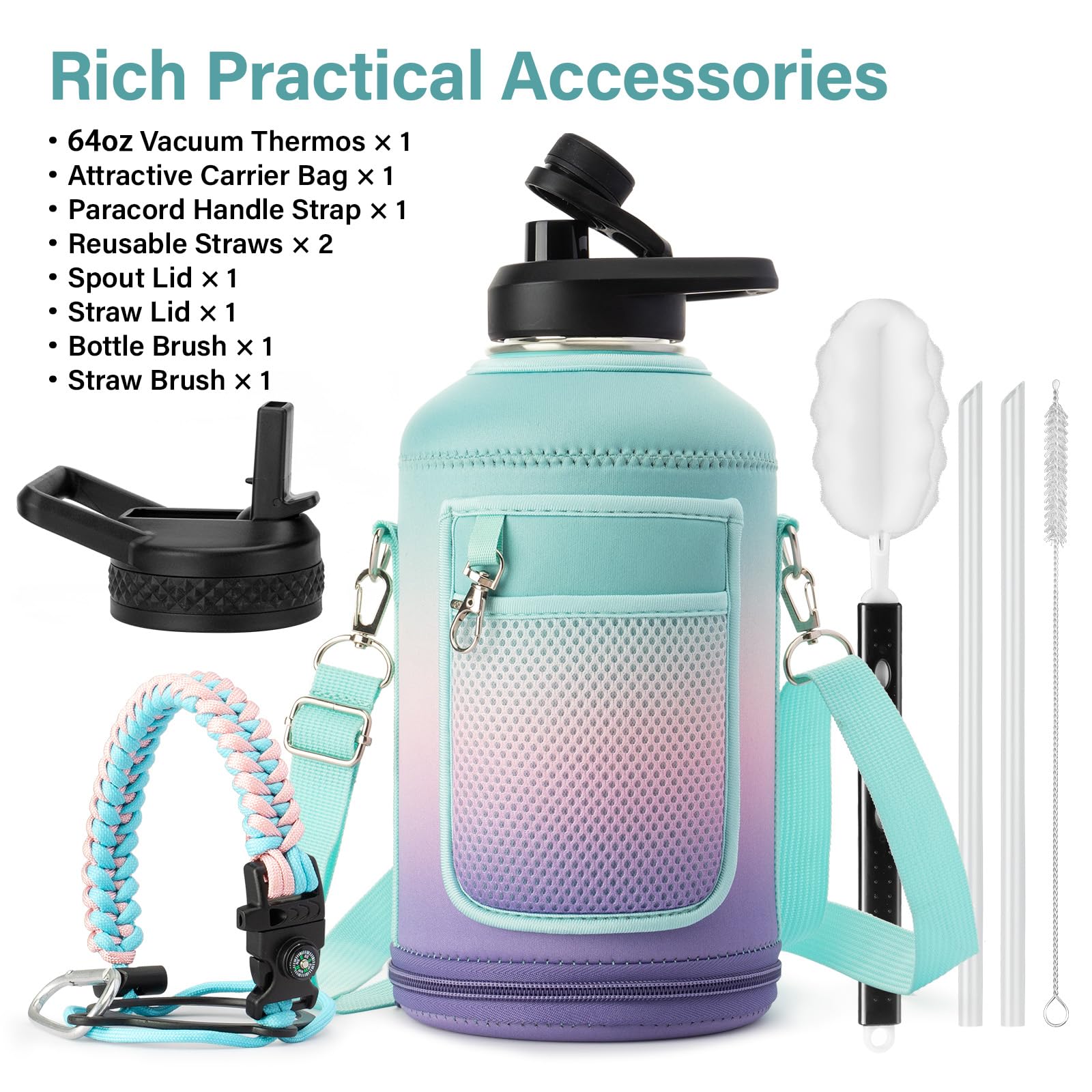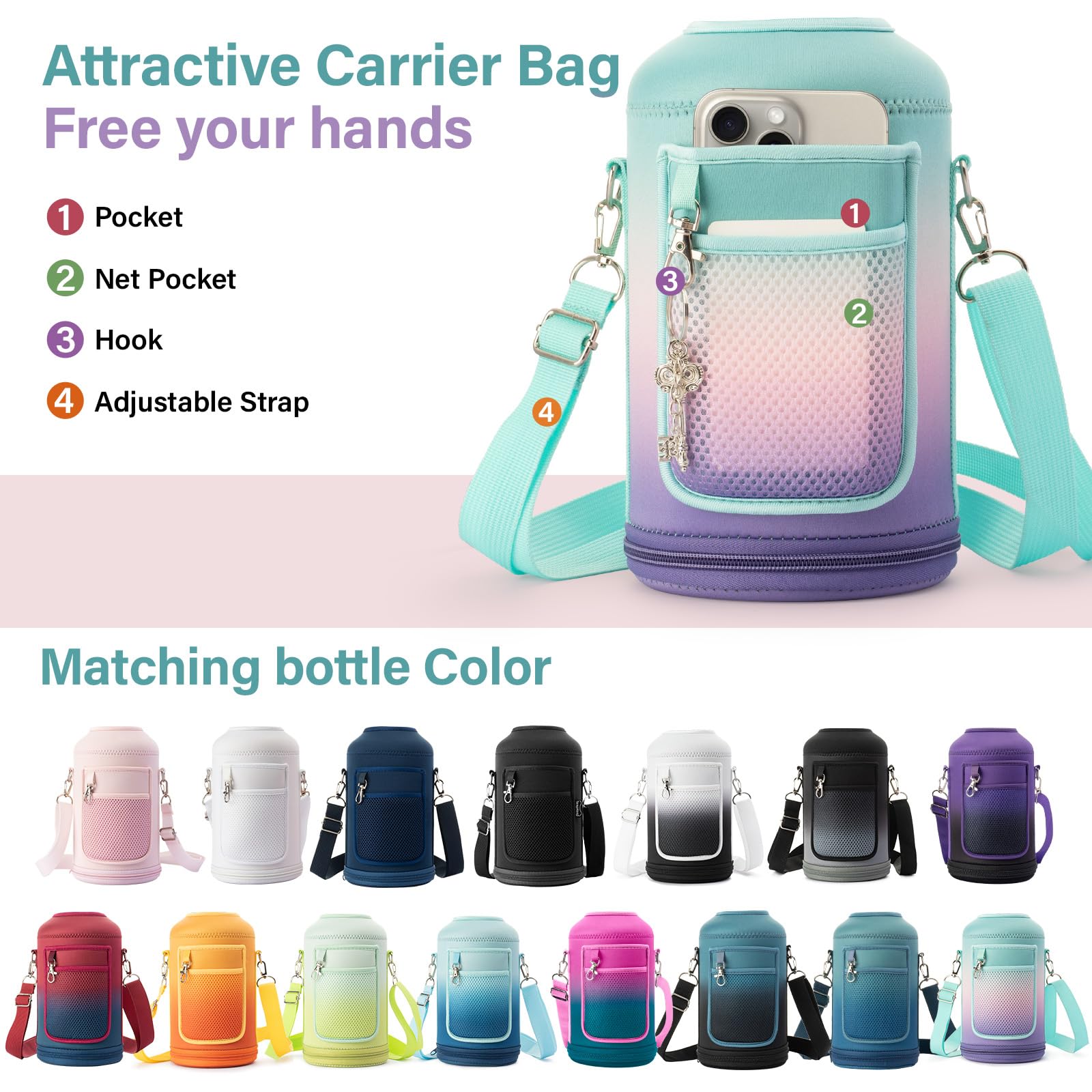 VERSATILE AND STYLISH CARRIER BAG:The colorful water bottle carrier bag is designed to match the bottle's body, adding a touch of flair while providing practical functionality. The shoulder strap and carabiner make it easy to carry and hang, whether you're out on a hike or running errands. Plus, the small storage bag for your phone and a hook for keys make this bottle even more versatile.