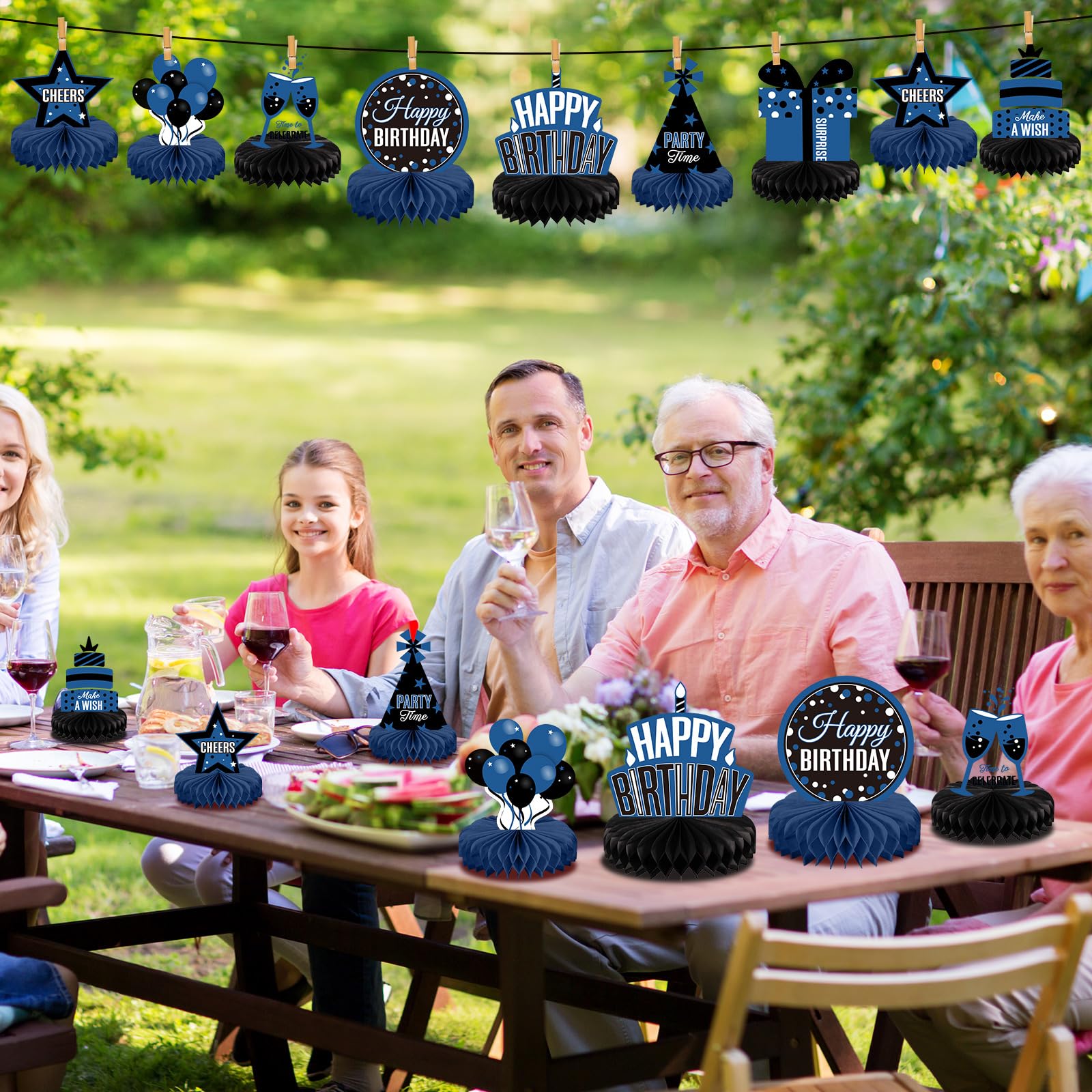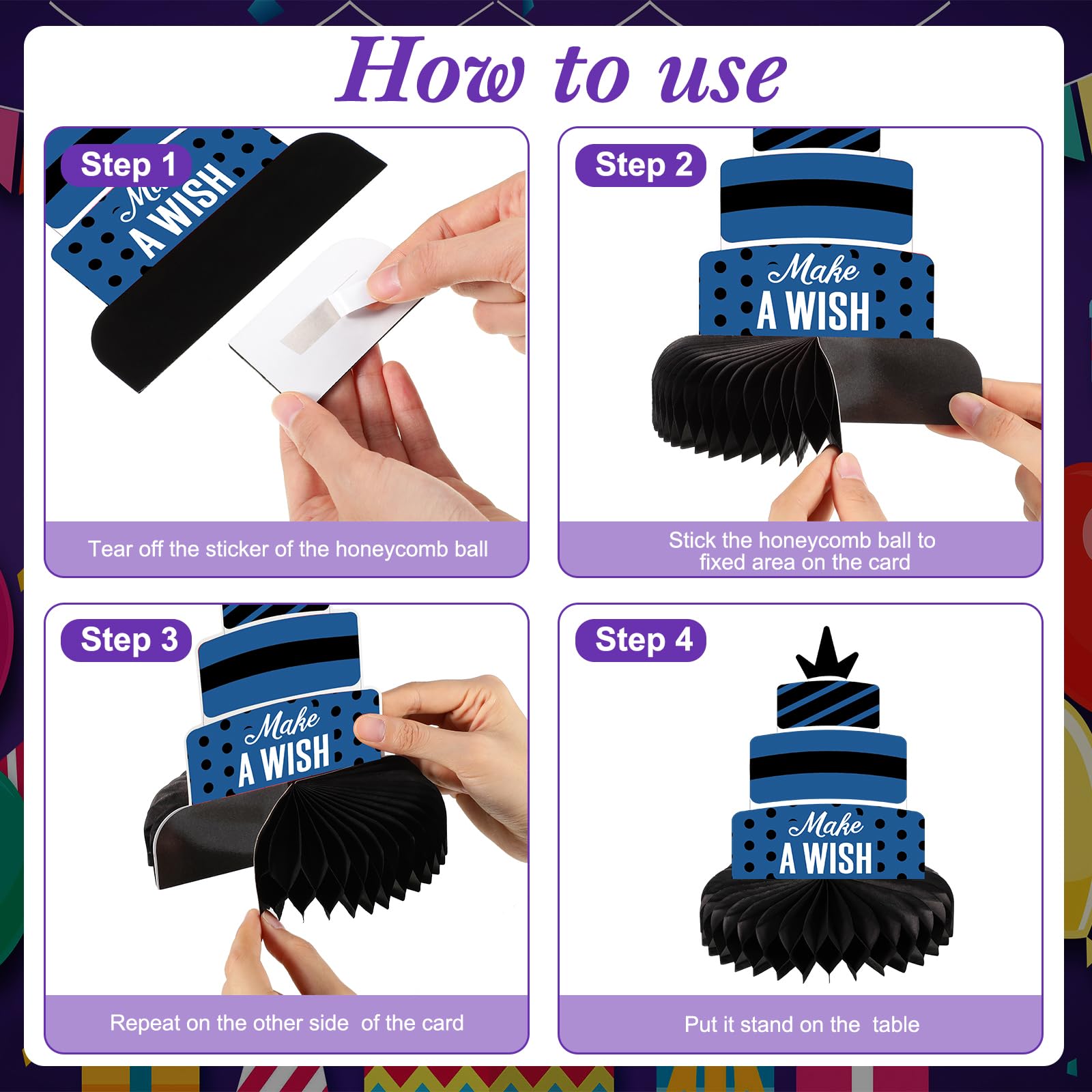 Easy to Assemble: our blue birthday table centerpiece decorations are reserved with stickers, you only need to tear off the honeycomb sticker, paste the honeycomb ball to the bottom of the card and fix it, and finally gently unfold the honeycomb ball by hand, which can complete the assembly, simple and convenient