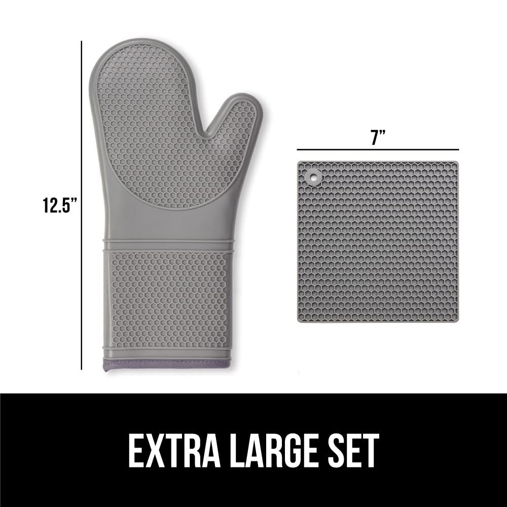 FOOD GRADE AND BPA FREE: tested to be safe for direct contact with food, these mitts are food grade and BPA free and a perfect choice for any home; plus, oven mitt is 12.5 inches long and trivet is 7 by 7 inches long to allow for maximum coverage