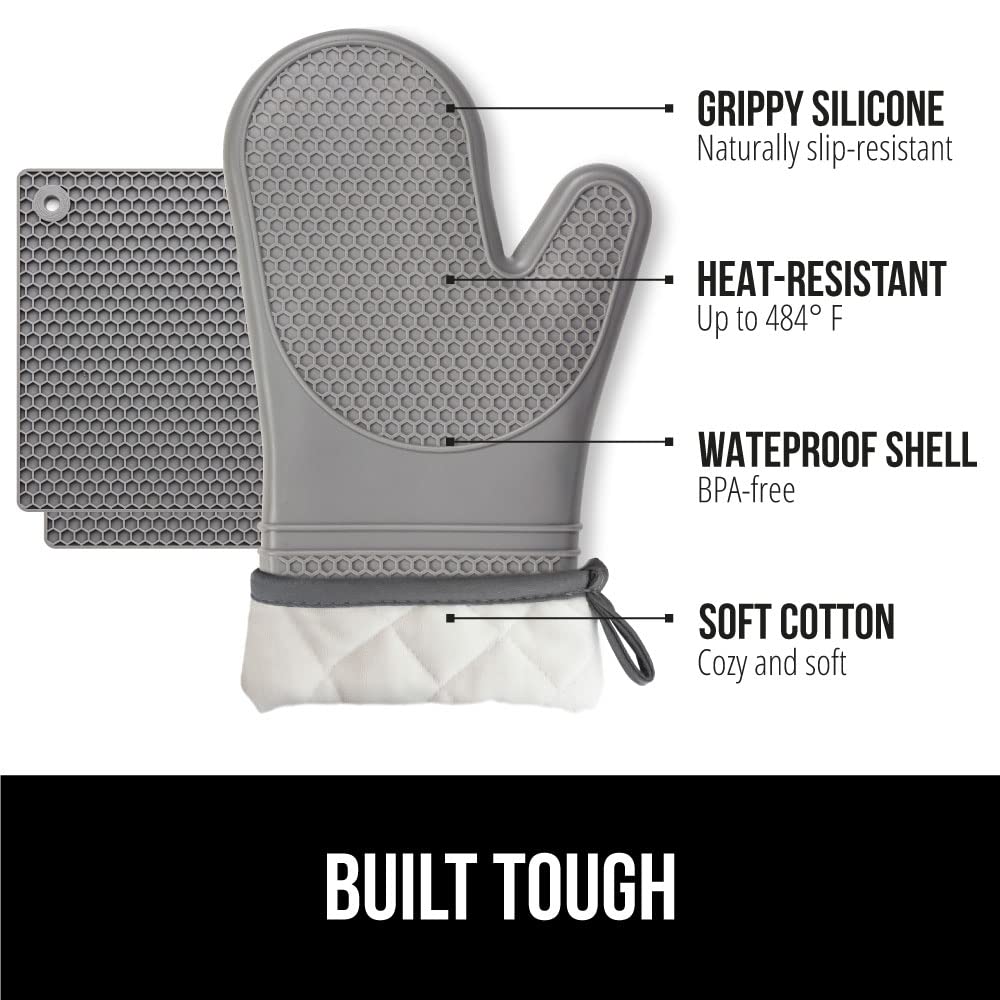 WATERPROOF AND STAIN RESISTANT: no more constantly stained oven mitts and trivets; Gorilla Grip Silicone Mitts and Trivets are both stain resistant and waterproof; spills can easily and instantly be rinsed away under water; hot liquids won’t soak through and scald your skin as they would with other materials; trivets are also dishwasher safe