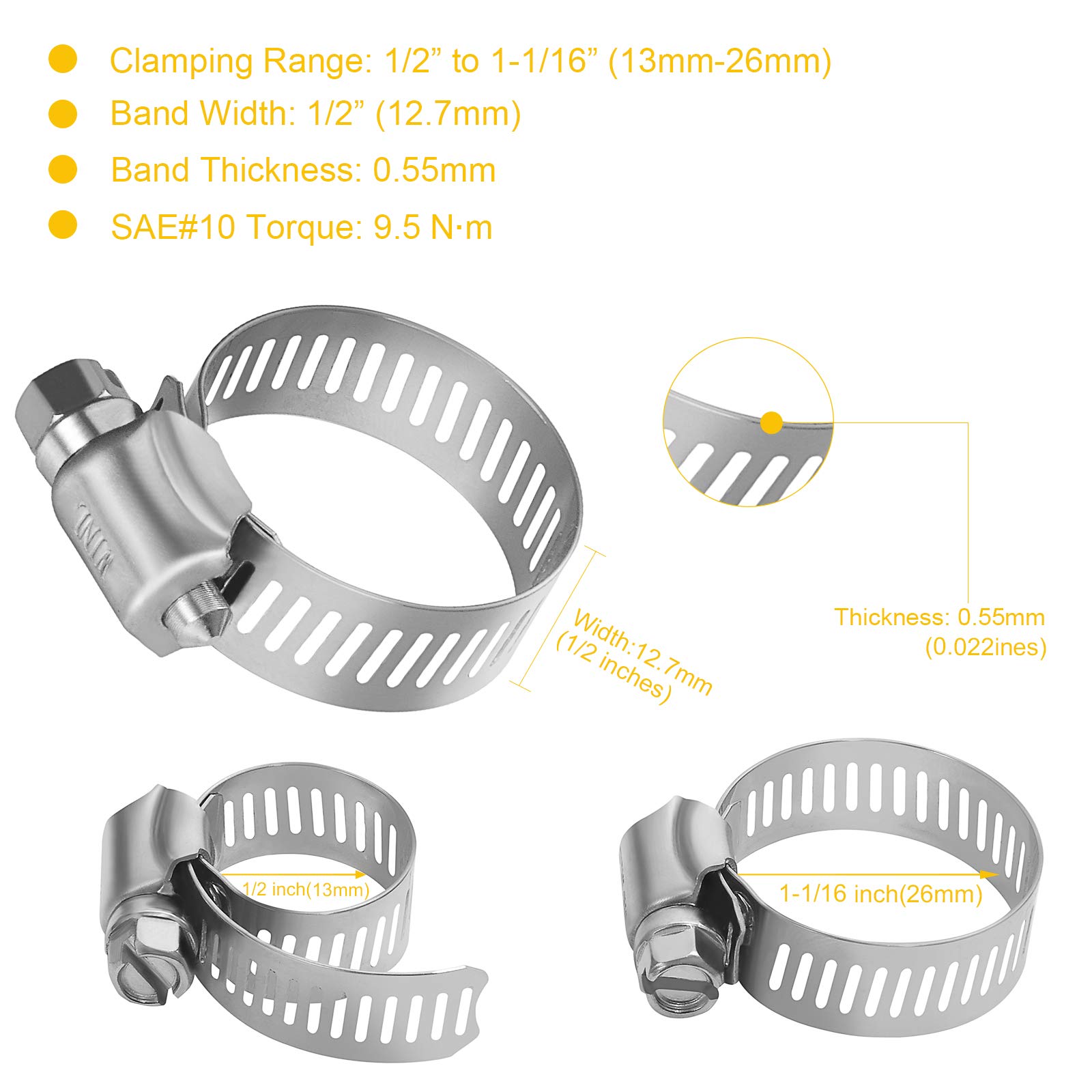 Remarkable Performance: WINL stainless steel hose clamps are high torque, easy to install, adjustable range, secure hold and smoothly drive. The SAE size#10 hose clamps have clamping range from 1/2 inch to 1-1/16 inch (from 13mm to 26mm), great for hose or pipes within this range, perfect as 1/2 inch hose clamps, 3/4 inch hose clamps, 7/8 inch hose clamps, 1 inch hose clamps etc.. The average torque of the hose clamps is 9.5N, much higher than the standard torque 6.78N.