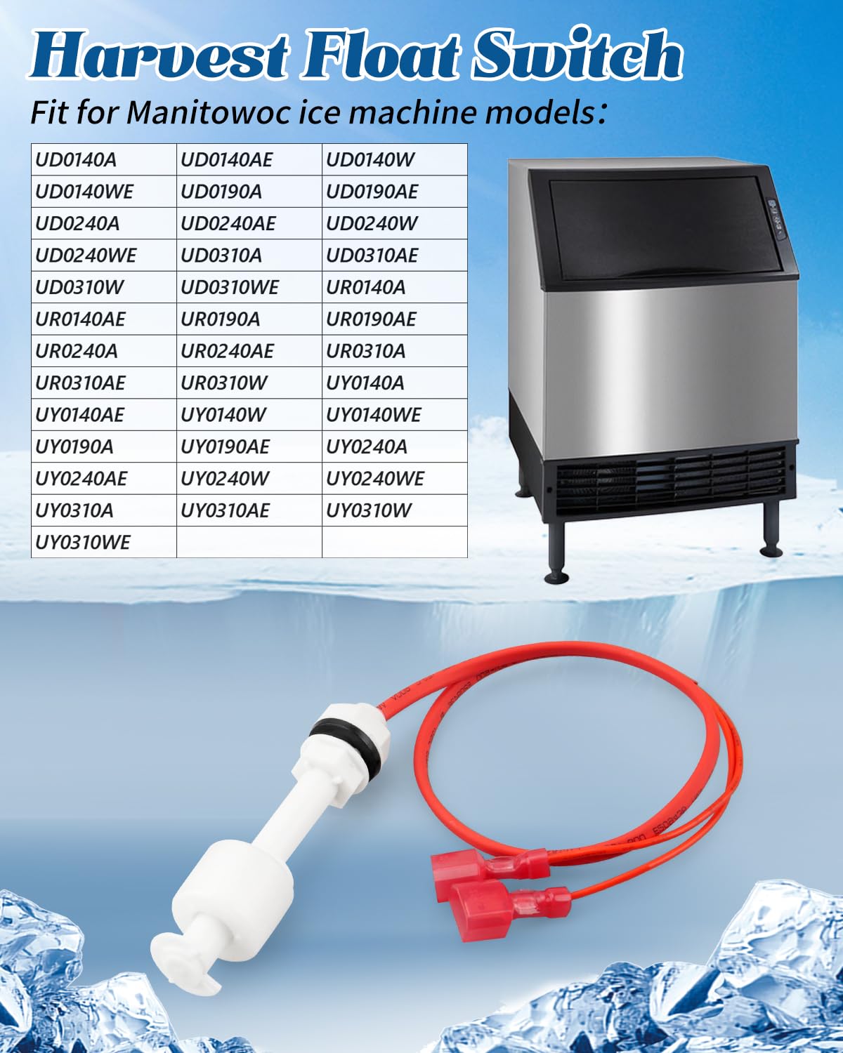 Wide Compatibility This 040002396 ice machine float switch fits for Manitowoc UD0140A, UD0140AE, UD0140W, UD0140WE, UD0190A, UD0190AE, UD0240A, UD0240AE, UD0240W, UD0240WE, UD0310A, UD0310AE, UD0310W, UD0310WE, UR0140A, UR0140AE, UR0190A, UR0190AE, UR0240A, UR0240AE, UR0310A, UR0310AE, UR0310W, UY0140A, UY0140AE, UY0140W, UY0140WE, UY0190A, UY0190AE, UY0240A, UY0240AE, UY0240W, UY0240WE, UY0310A, UY0310AE, UY0310W, UY0310WE If uncertain about compatibility or installation, contact our team for prompt assistance The Advantages of The Float Switch: Precise Ice Level Detection Automatic Harvest Cycle Activation Smart Water Flow Adjustment Eliminates Ice Block Clumping Resolves Ice Production Interruptions The device further enhances system safety by triggering alerts when water levels exceed predefined thresholds, enabling timely interventions to avoid equipment strain