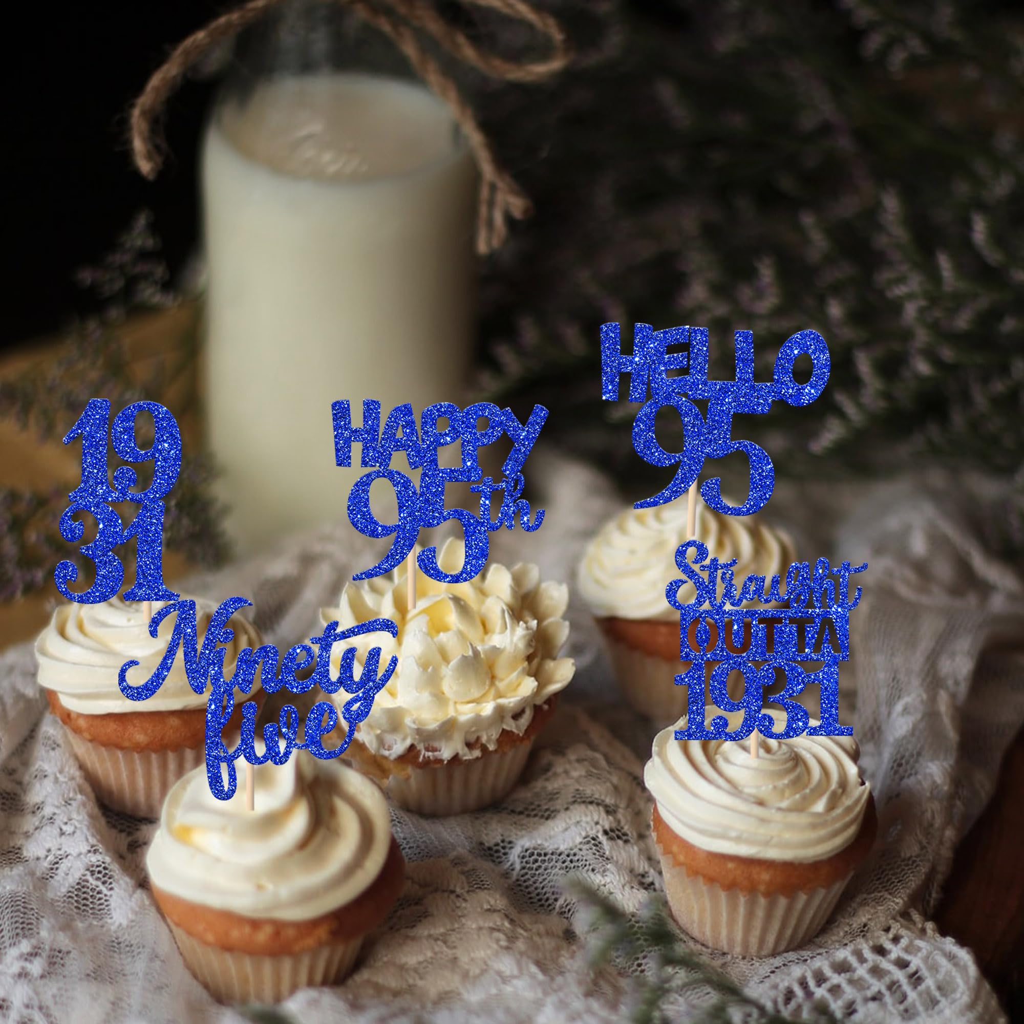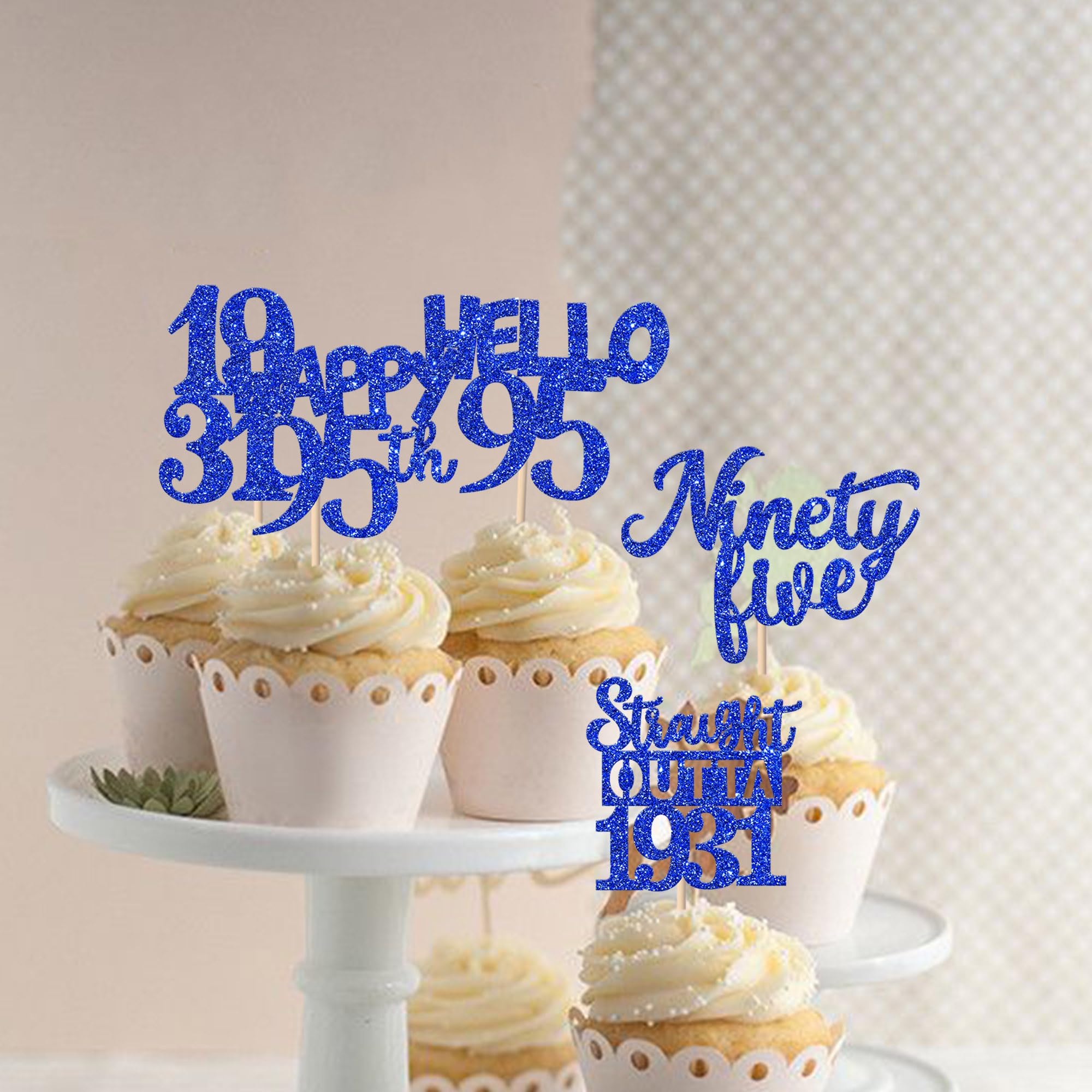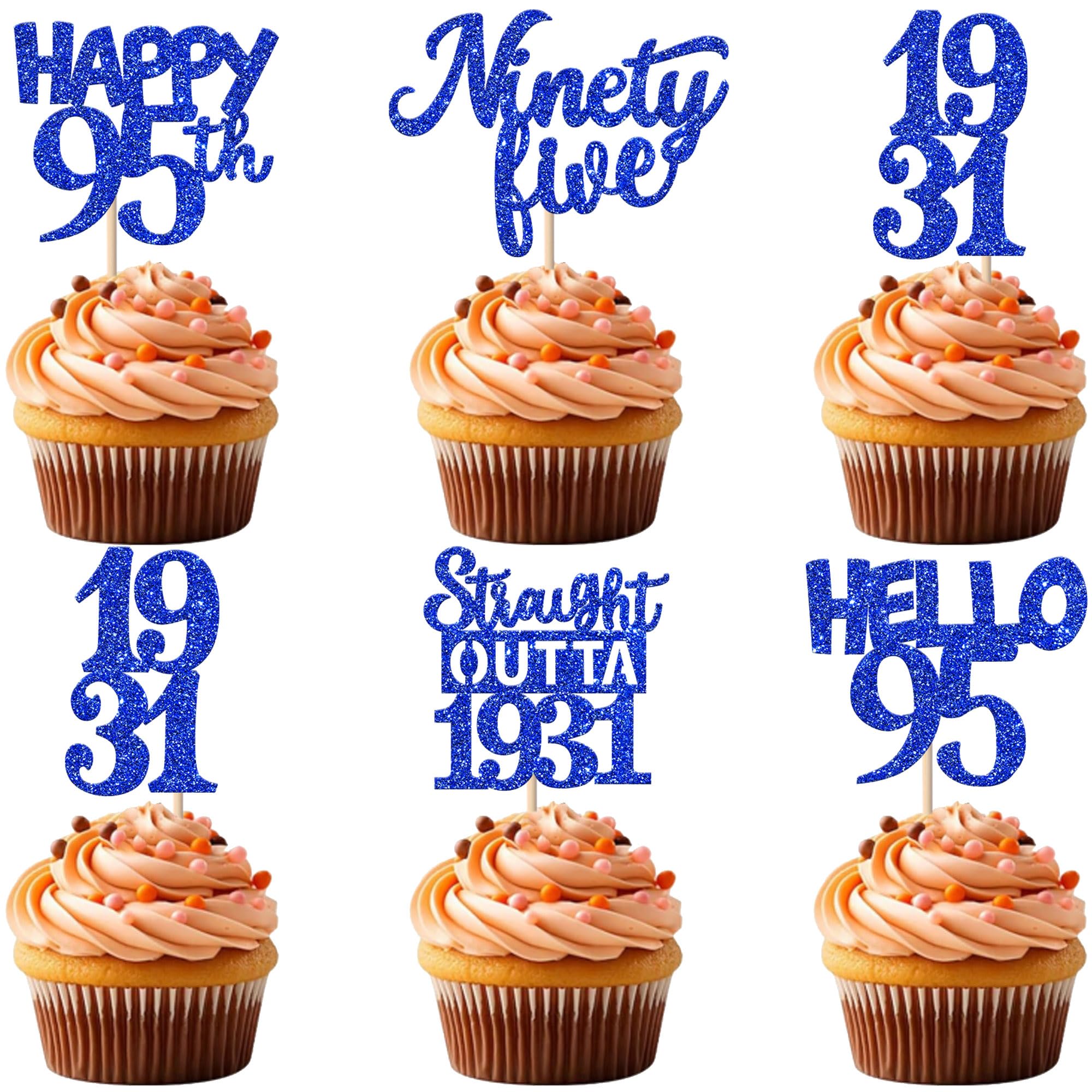 30 PCS 95th Birthday Cupcake Toppers Glitter Ninety Five Happy 95th Straight Outta 1931 Cupcake Picks for Cheers to 95 Fabulous 95th Birthday Anniversary Party Cake Decorations Supplier Blue Perfect for happy 95th bithday theme party, straight outta 1931 theme party, 95th wedding anniversary theme party,cheers to 95 years theme party cupcake decorations supplies. Pack of 30 pcs, 6 pcs of each design. The size is 1.9*4.6 inch / 1.3*3.9 inch / 2.1*4.6 inch / 2.9*3.9 inch / 2.2*4.5 inch ( with stick ) Made of high quality paper card stock,thick and sturdy. These straight outta 1931 cupcake toppers are one side glitter, another side is white, and they are intended for decoration only, please do not put them in oven or microwave. If the item you received has any defects, please contact us immediately. we will deal with it within 24 hours.