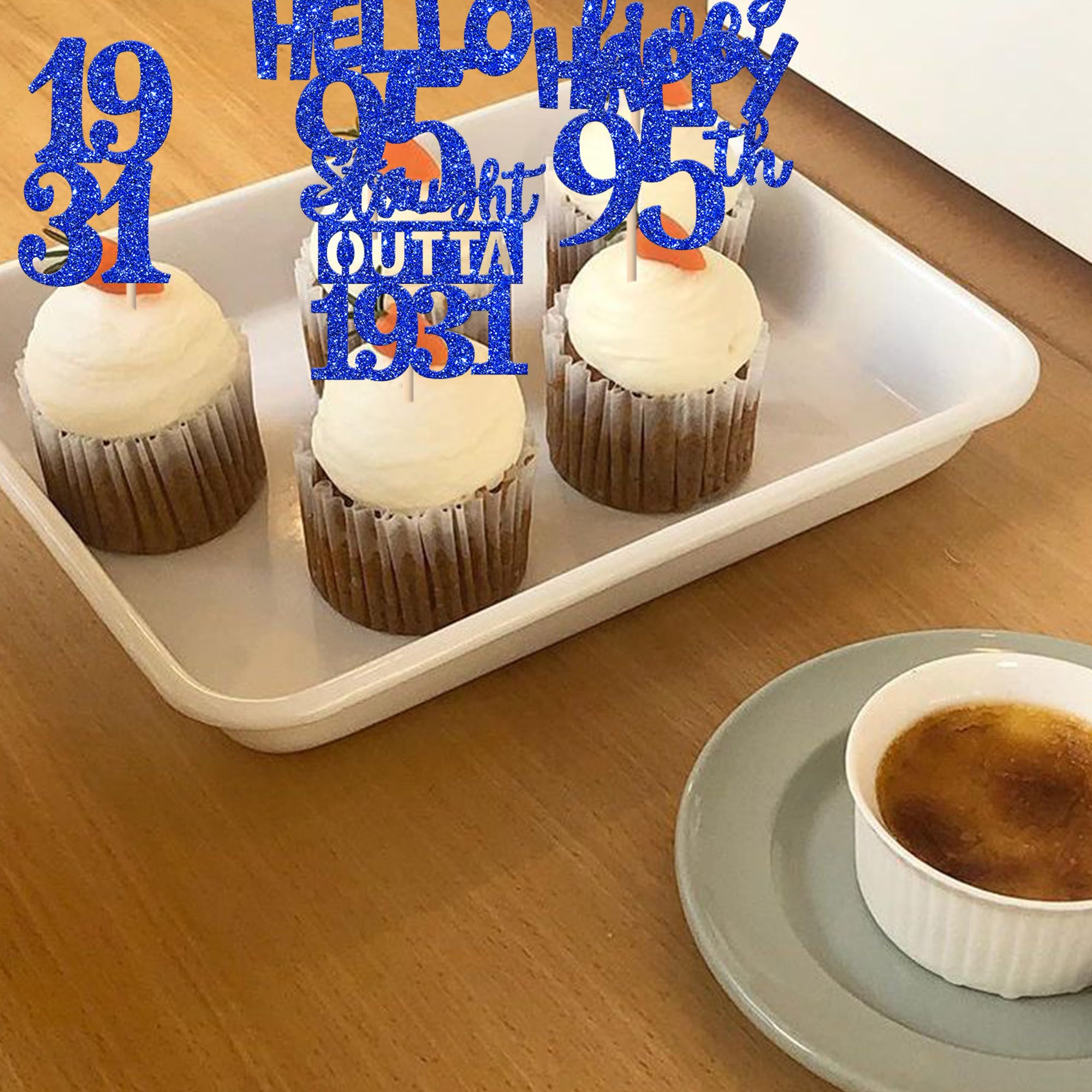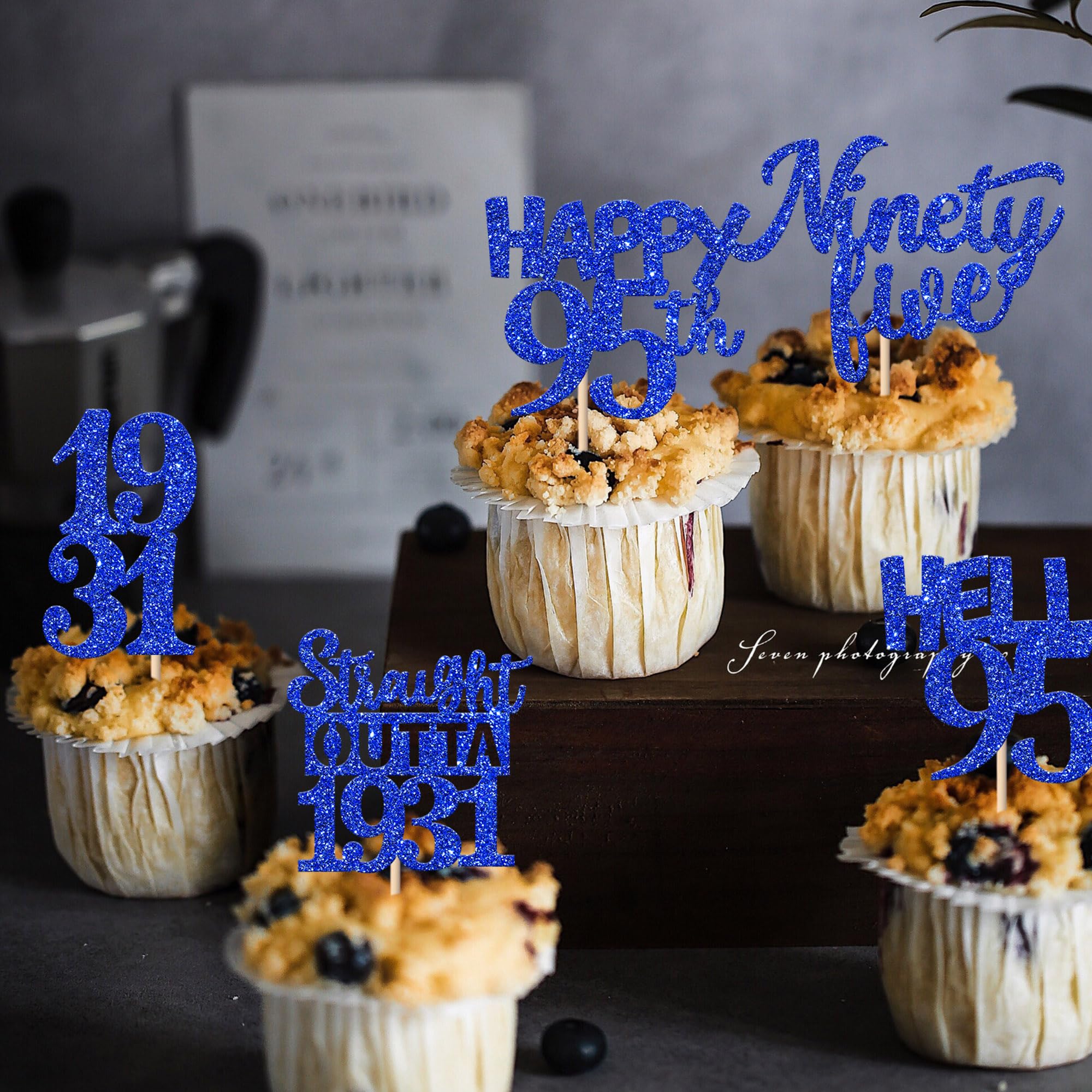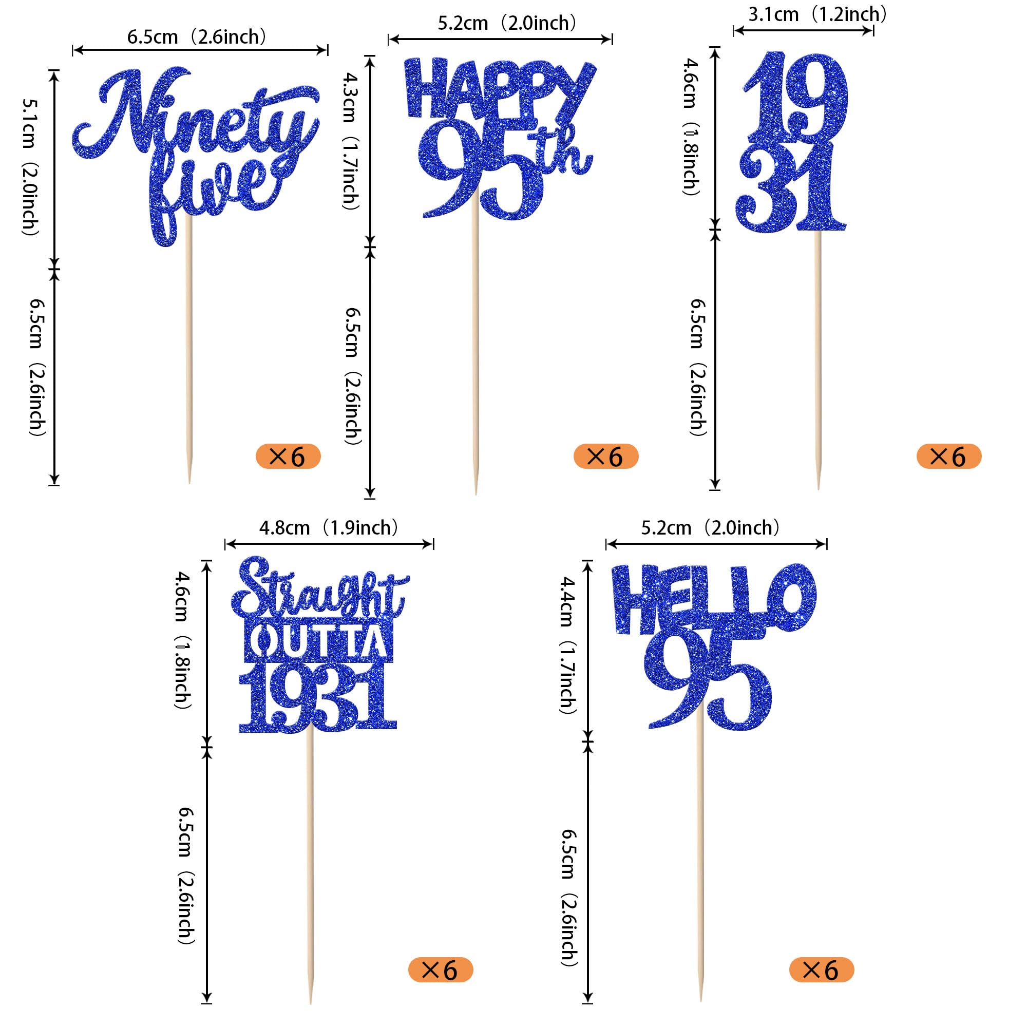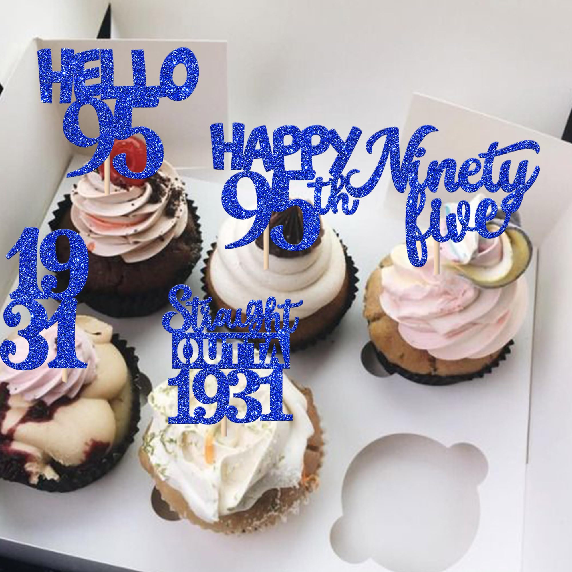 30 PCS 95th Birthday Cupcake Toppers Glitter Ninety Five Happy 95th Straight Outta 1931 Cupcake Picks for Cheers to 95 Fabulous 95th Birthday Anniversary Party Cake Decorations Supplier Blue Perfect for happy 95th bithday theme party, straight outta 1931 theme party, 95th wedding anniversary theme party,cheers to 95 years theme party cupcake decorations supplies. Pack of 30 pcs, 6 pcs of each design. The size is 1.9*4.6 inch / 1.3*3.9 inch / 2.1*4.6 inch / 2.9*3.9 inch / 2.2*4.5 inch ( with stick ) Made of high quality paper card stock,thick and sturdy. These straight outta 1931 cupcake toppers are one side glitter, another side is white, and they are intended for decoration only, please do not put them in oven or microwave. If the item you received has any defects, please contact us immediately. we will deal with it within 24 hours.