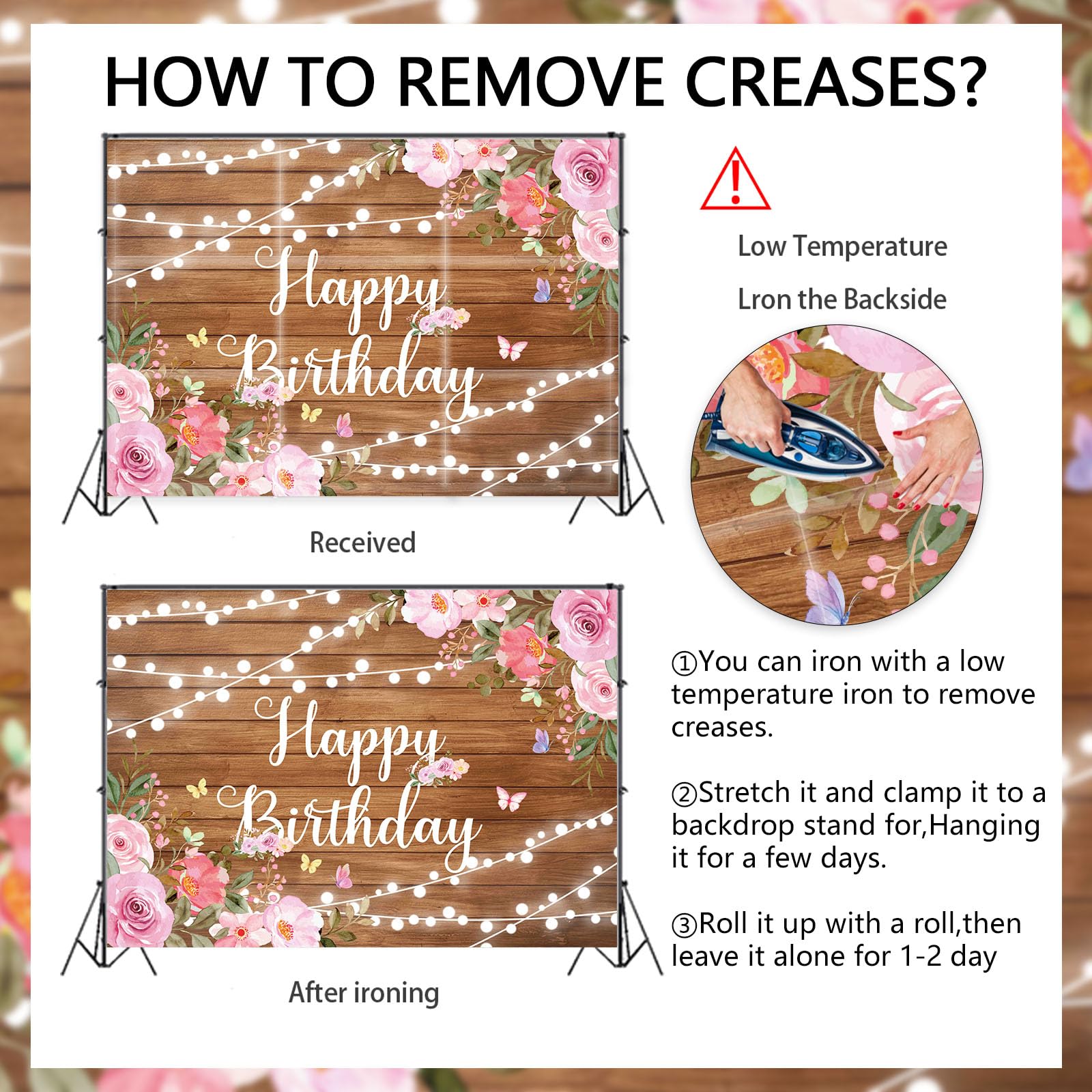 Easy to Hang: Our happy birthday backdrop for women can be fixed to the stand with clips or hung on the wall with the supplied rope (please note that clips are not included in the package).Warm Note: Due to shipping reasons, the birthday photo backdrop is folded on board and may have creases that can be reduced by ironing, steaming or packing fabric.