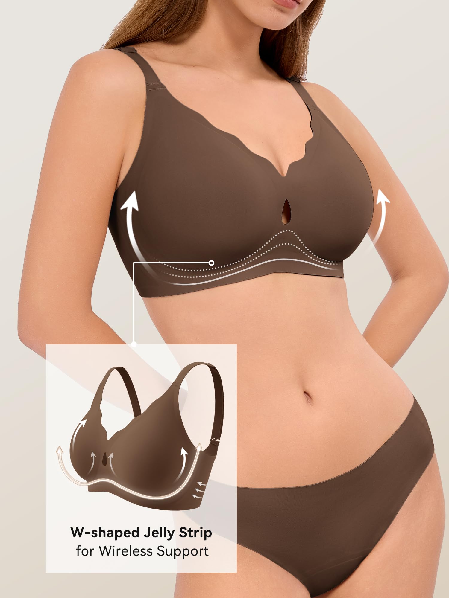 "W" JELLY STRIPE WIRELESS BRA: Women's full coverage bras with no underwire designed with "W” shaped “jelly strips” to support and lift the bust 360°. Our everyday bras with support are paired with semi-fixed padding to fit a variety of bust shapes seamlessly. The breast pads create a naturally rounded, fuller shape for younger women and provide ultimate comfort and support for older women. CARE INSTRUCTIONS: HAND WASH OR MACHINE WASH IN A LAUNDRY BAG.