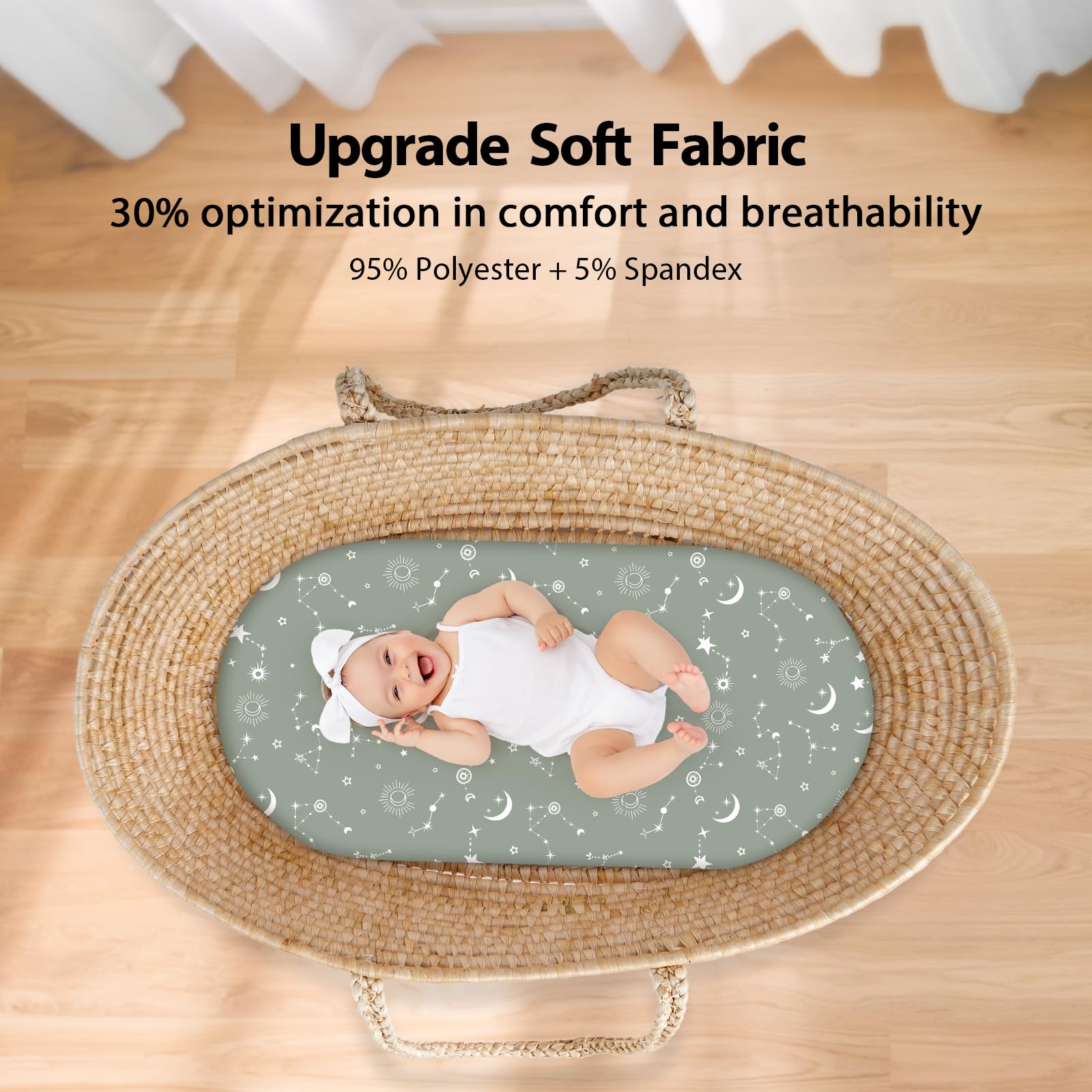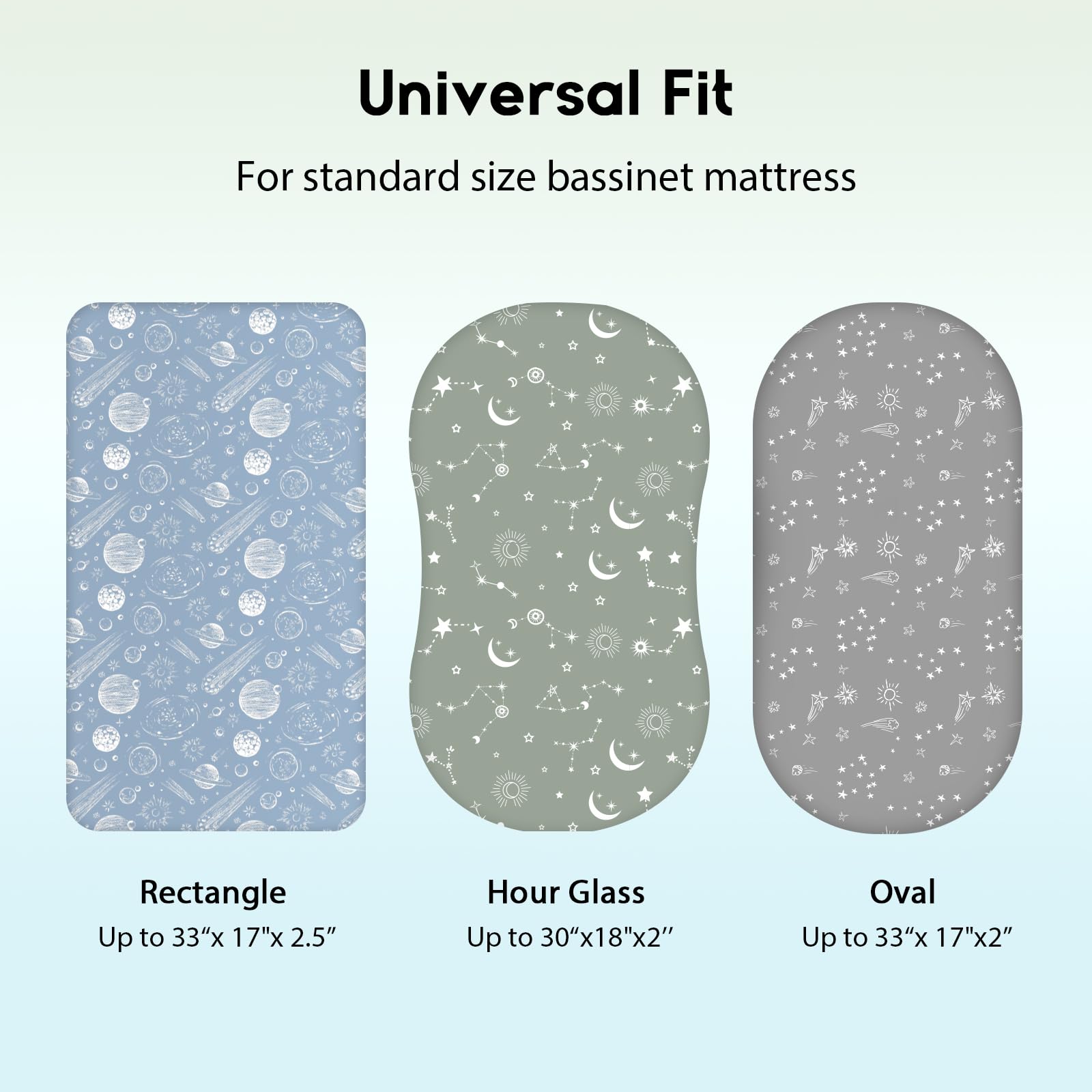 Perfect Size: Measured 32"x16", universal bassinet sheets snugly fit for most popular mattresses, such as standard oval, round, rectangular, and hourglass. 5-Inch pocket provides full coverage and protection for your mattress.