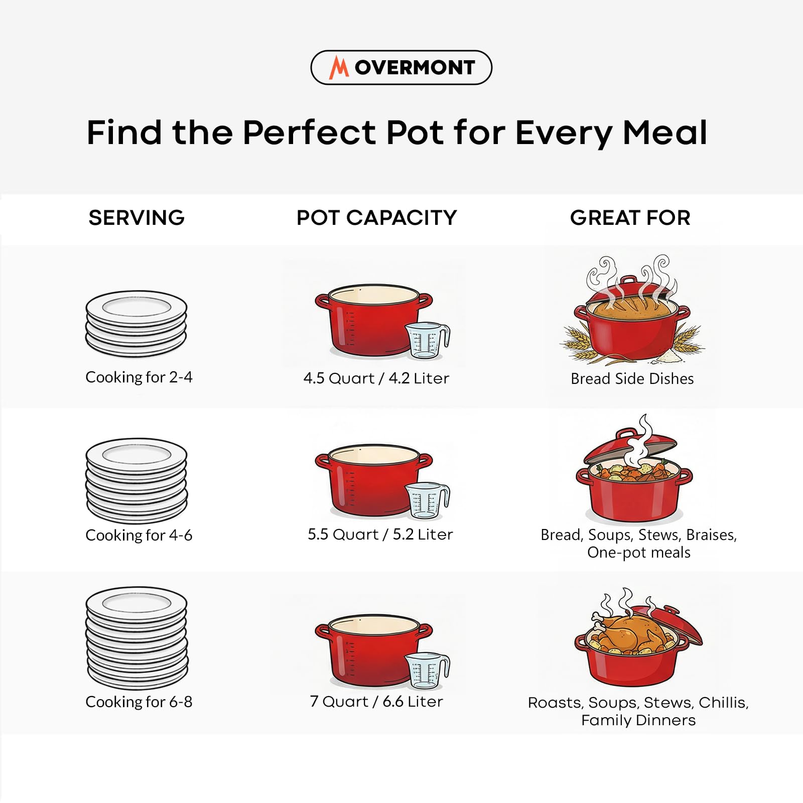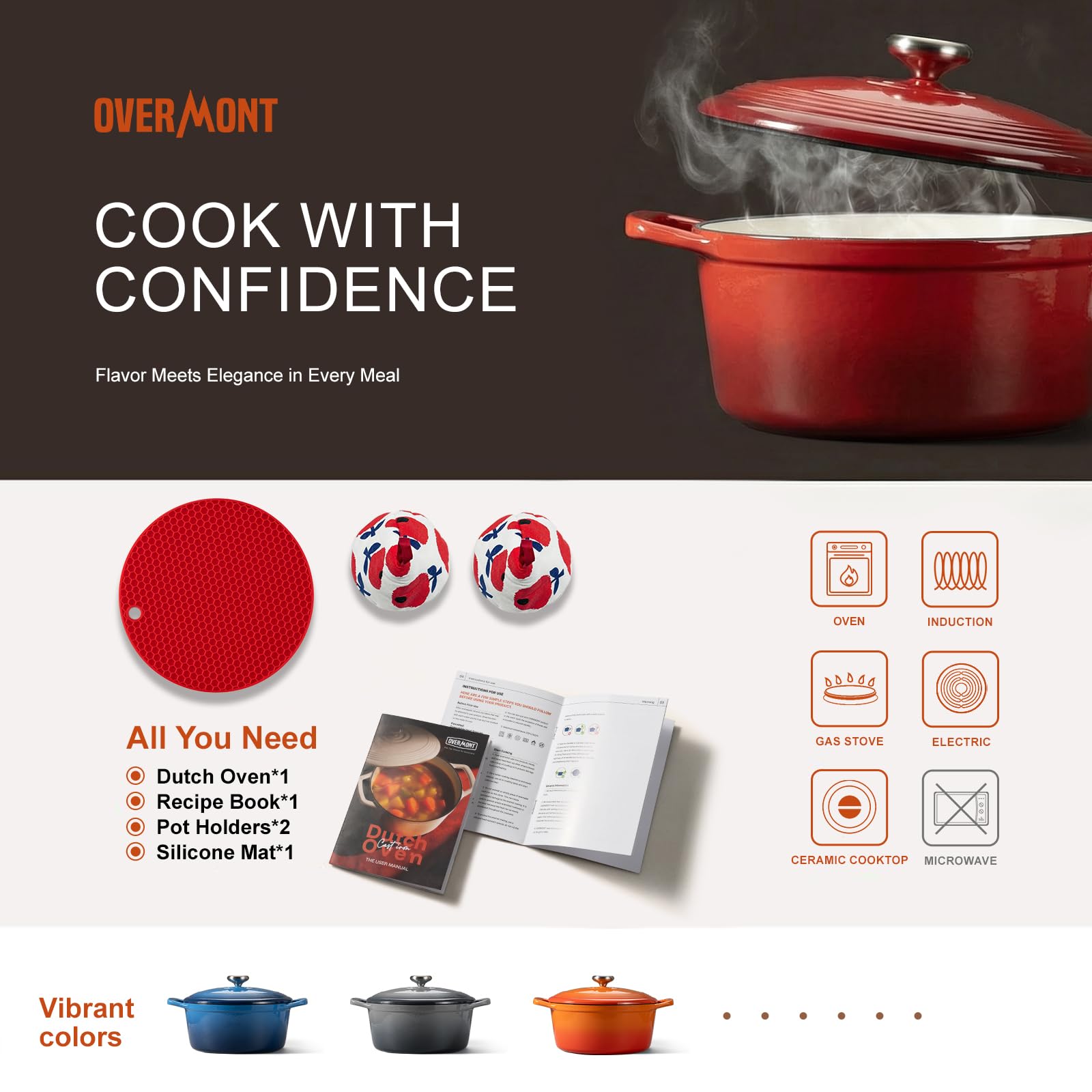 【Universal Compatibility】Our premium enamel Dutch oven is designed to shine on various stovetops, including gas, electric and ceramic. Plus, it's oven safe up to 500℉, offering an exceptional range of cooking options. From stewing to roasting, this Overmont upgraded Dutch oven can handle it all.