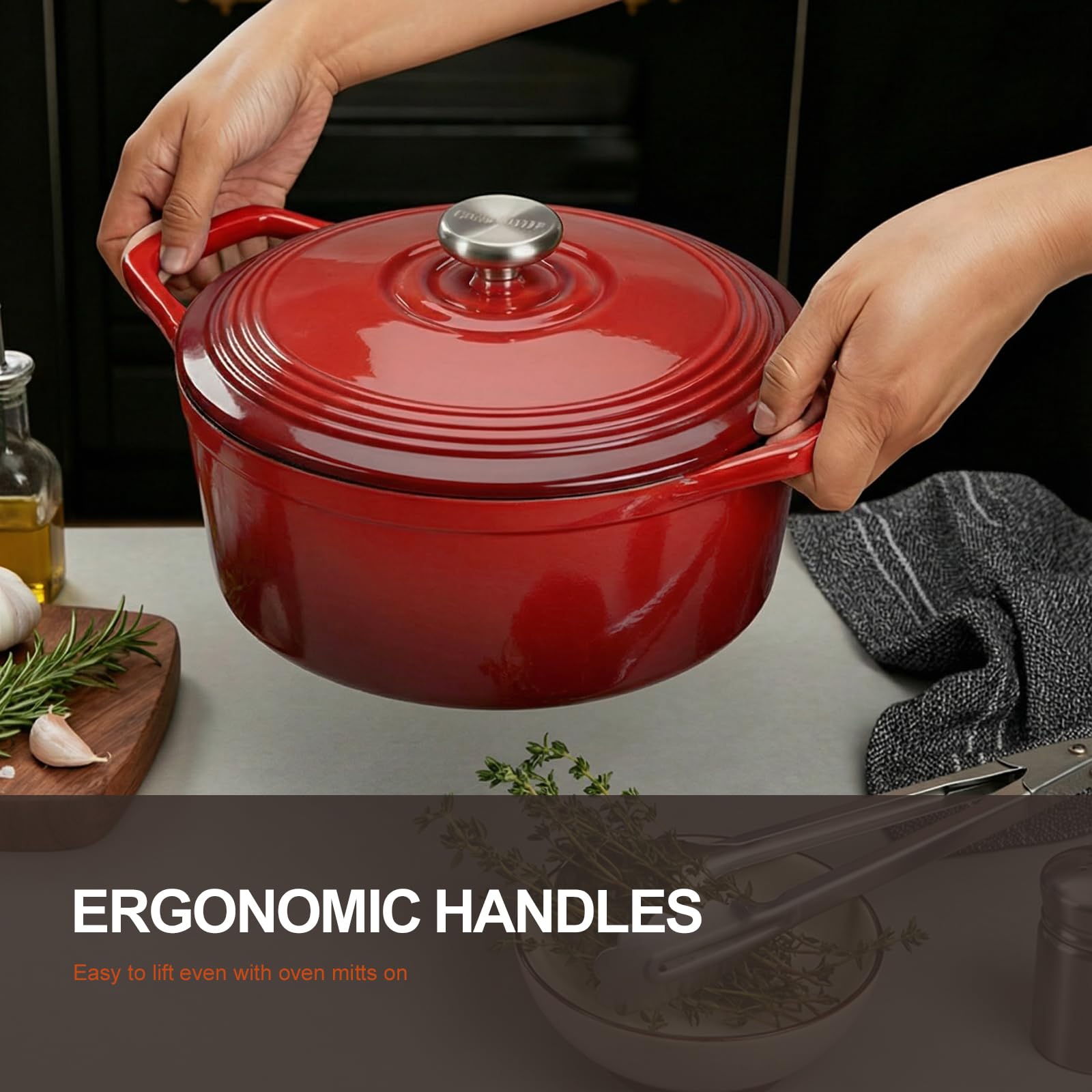 【Safety & Convenience】Our Dutch oven features widened, upward-angled loop handles designed with ergonomics in mind, ensuring easy lifting even while wearing oven mitts. The upgraded step-style lid knob increases the distance from hot steam, reducing the risk of burns.